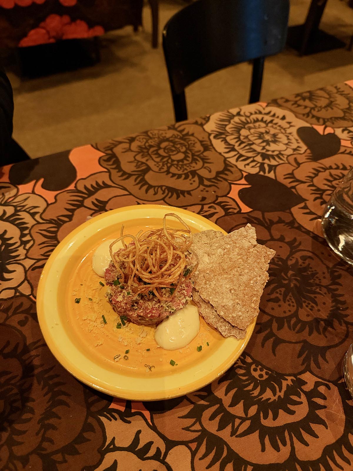 Andreas älskar råbiff så en sån tog vi in. Här med hembakt knäcke och senapskräm. På toppen ett nystan av svarvad och friterad potatis. Jag måste erkänna att det var väldigt gott. Under kvällen så kom en av kockarna/ägarna fram och frågade om vi var nöjda och småpratade lite. Eftersom vi var intresserade så berättade hon om hur de gjorde nystanet bland annat. Och att i princip allt är hemlagat.