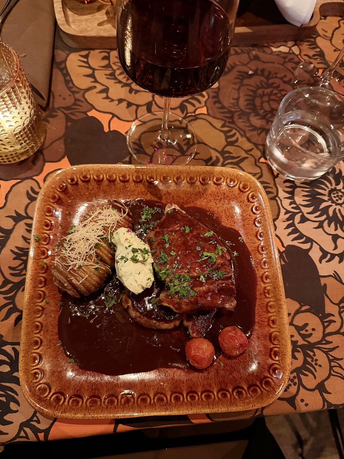 Sen var det dags för tredje serveringen. Jag brukar oftast ta fick när vi är ute och äter, men den lite större fiskrätten var full med citron eller lime, som jag är allergisk mot. Jag tog istället biff med hasselbackspotatis, rödvinssky och chimichurrismör. Smöret innehöll också citron, men det var ju lätt att låta bli. Smakade lite av smöret som var svingott. Väldigt god och generöst tilltagen rätt. Det syns inte så bra, men det är två stora köttbitar. Potatisen kanske var i lite underkant, men hellre åt det hållet än tvärtom så det känns snålt.