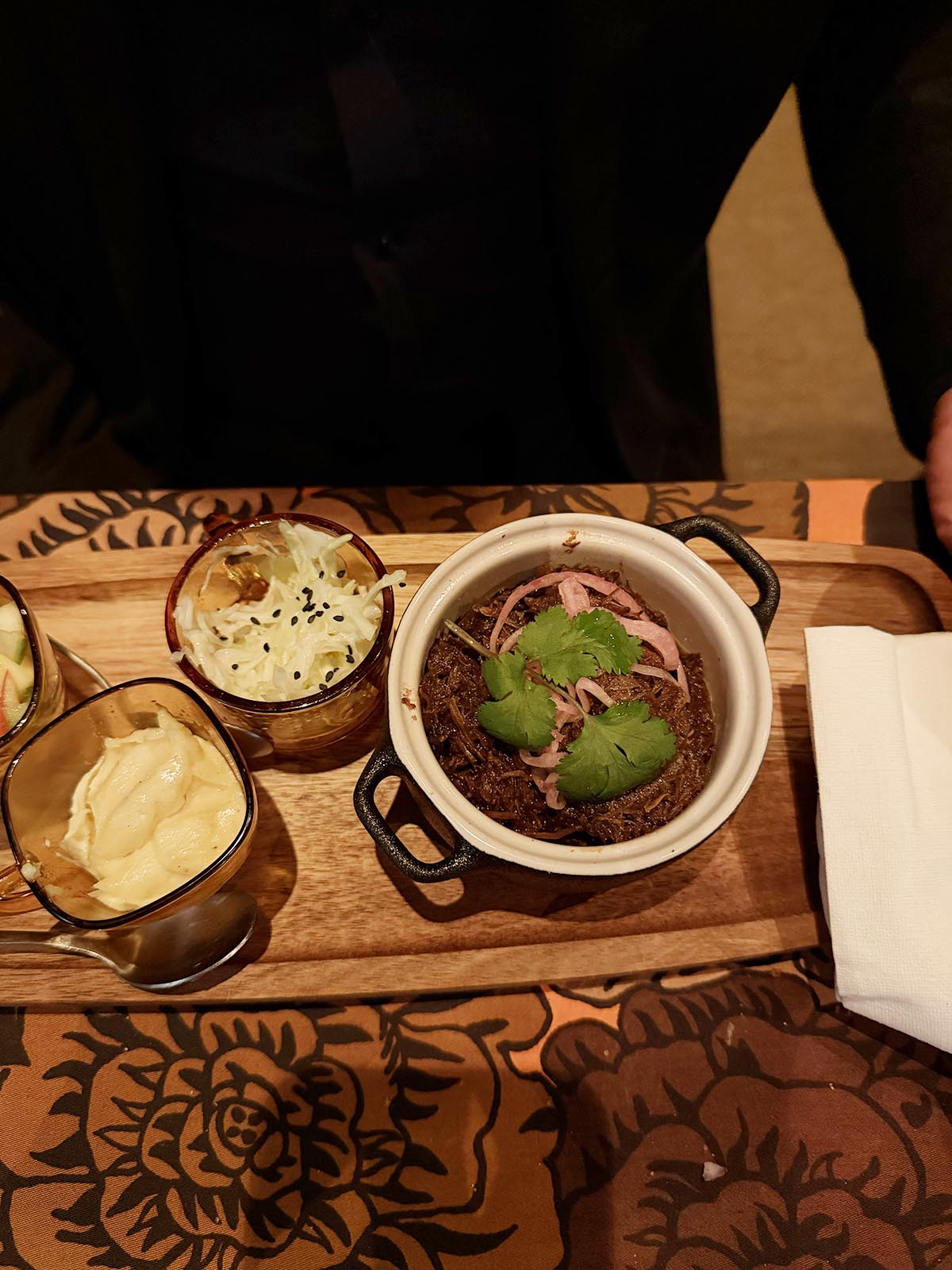 Andreas tog oxkind, med hembakt ljummet bröd där man la på köttet och det som fanns i de små kopparna. Det var en vitkålssallad, majo och en salsa på gurka, äpple och chilli. Sen smakade vi av varandra. Det påminde om pulled pork i konsistens och smak. Det smälte verkligen i munnen. Jag fick hoppa över det som var i kopparna. Till dessa rätter tog vi ett gott italienskt rött vin.