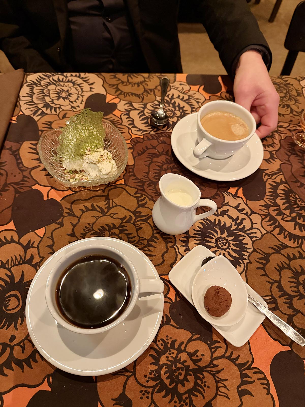 Vi toppade sen med kaffe och dessert. En tryffel som smälte i munnen. Och en indisk glass med kardemumma, pistagenötter och en fantastisk grön skapelse som var lite salt.