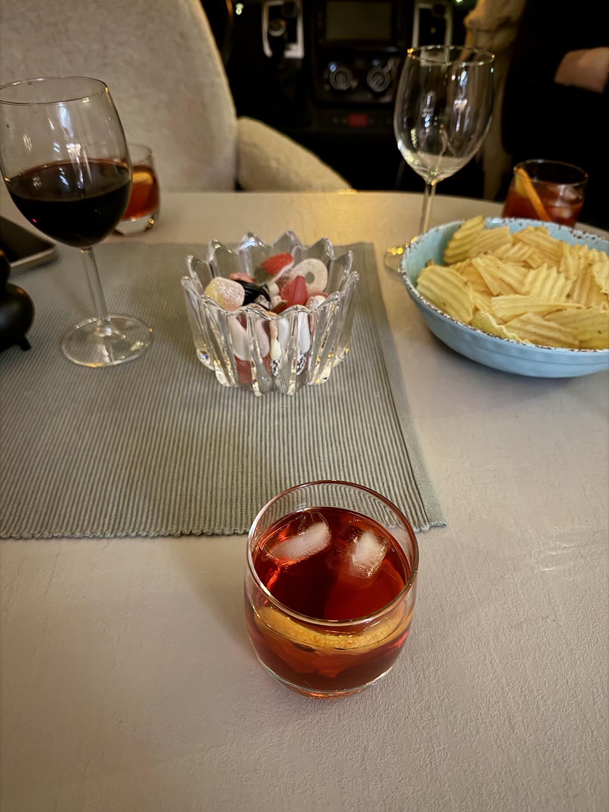Det bjöds på den klassiska italienska drinken Negroni, en del gin, en del Campari och en del Martini Rosso. Vi spelade ett tärningsspel, lyssnade på musik och pratade.