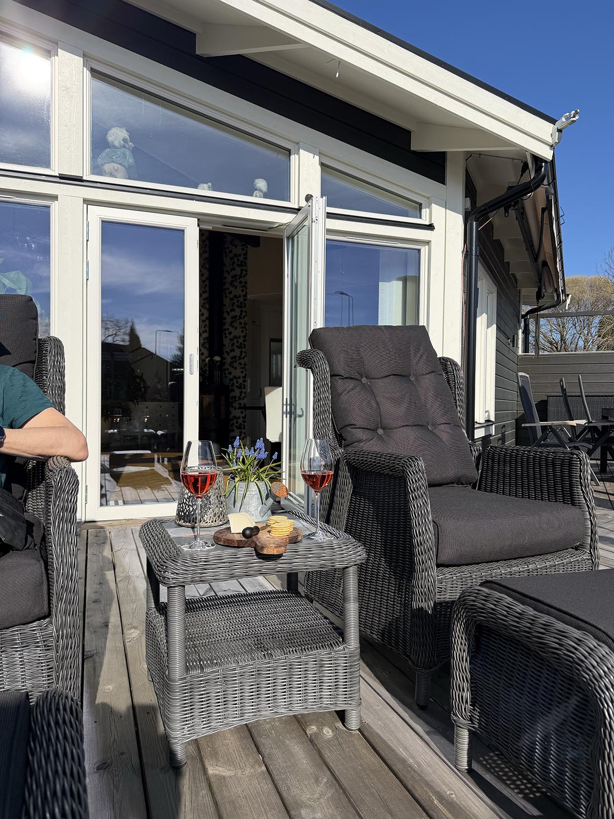 Efter att ha jobbat tre veckor på två veckor med efterföljande ganska full helg så var det skönt att landa där i fåtöljerna på eftermiddagen. Vi satt och pratade där i ett par timmar. Väldigt skönt att landa lite! Årets första utehelg hemma, hörrni! Den satt fint den!