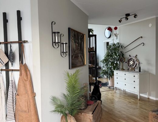 Ytterligare längre in finns en sliten byrå från min barndon, Andreas roder och hans morfars gamla käppar. Och ett egendesignat och egentillverkat vedställ i trä och armeringsjärn. Typ så fortsätter det i resten av hemmet. Och väggarna är målade i en varm beige kulör som skiftar i grönt i visst ljus.