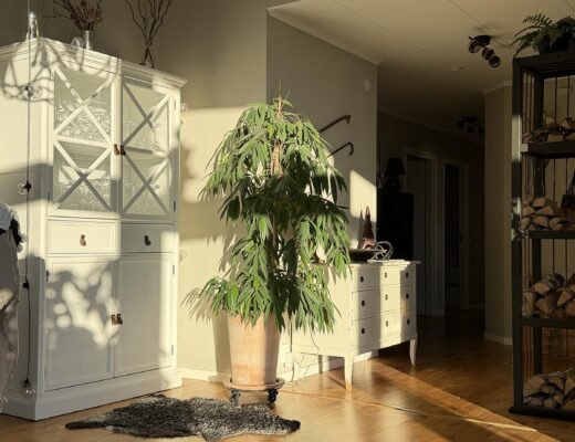 Och jag har också börjat med ledljus istället för levande. Jag har visserligen mest haft värmeljus i lykta, men även det är ju bra att passa. Dessutom har jag timer på ledljusen så det är så trevligt att det lyser när man kommer hem från jobbet. Även den tunna ljusslingan är det timer på. Väldigt trevligt med små ljuspunkter i ”skogen”, även om det knappt syns nån slinga på bilderna.