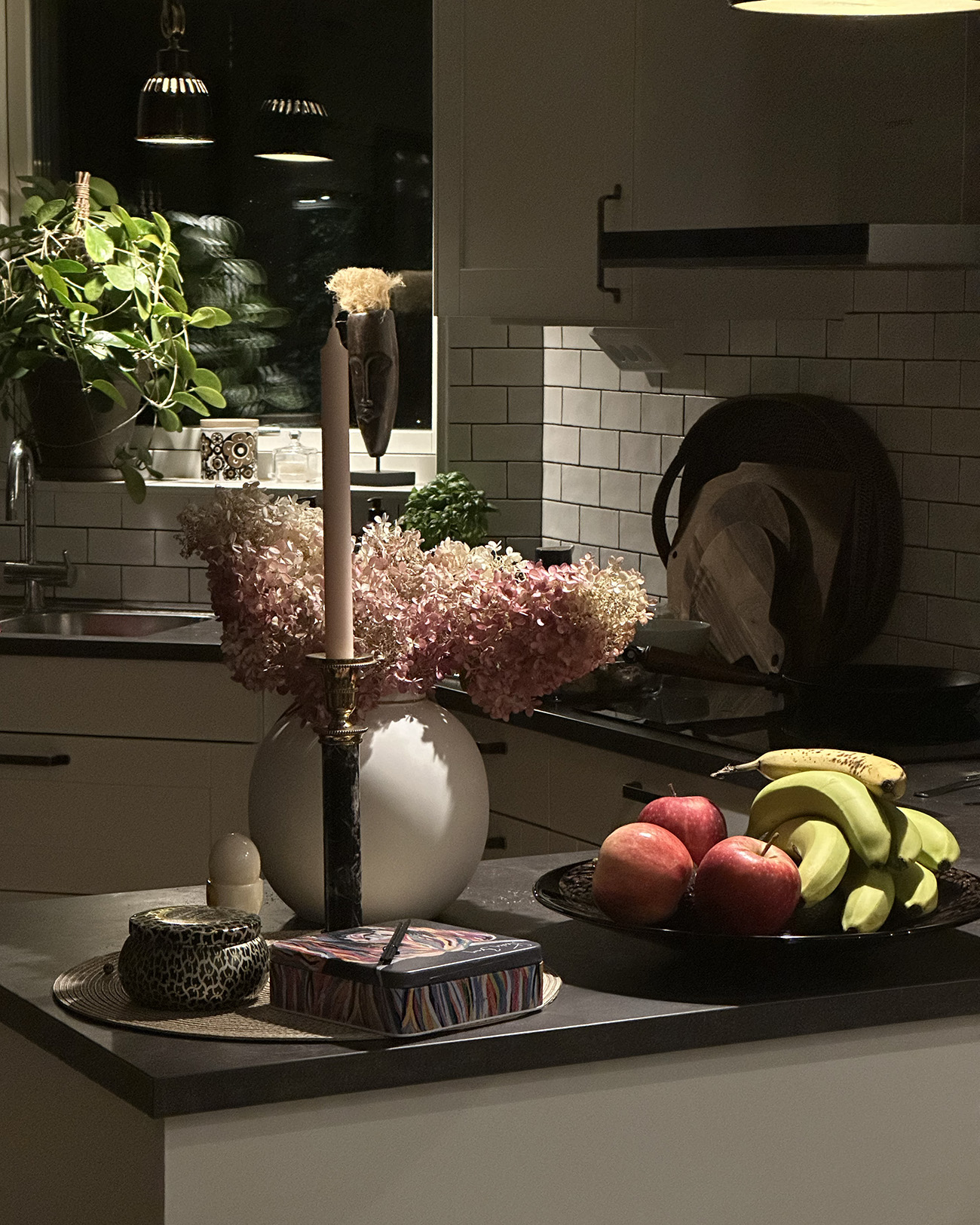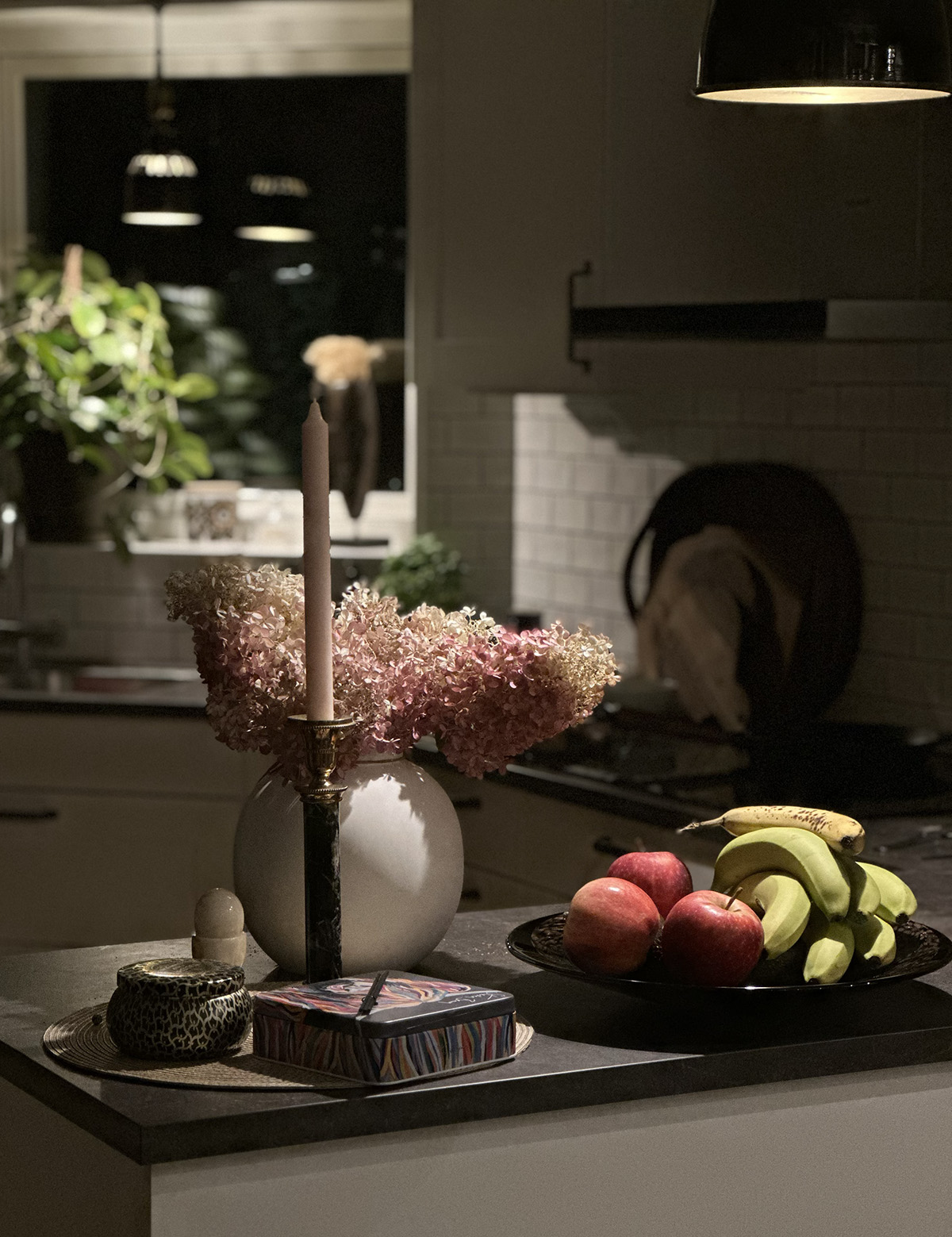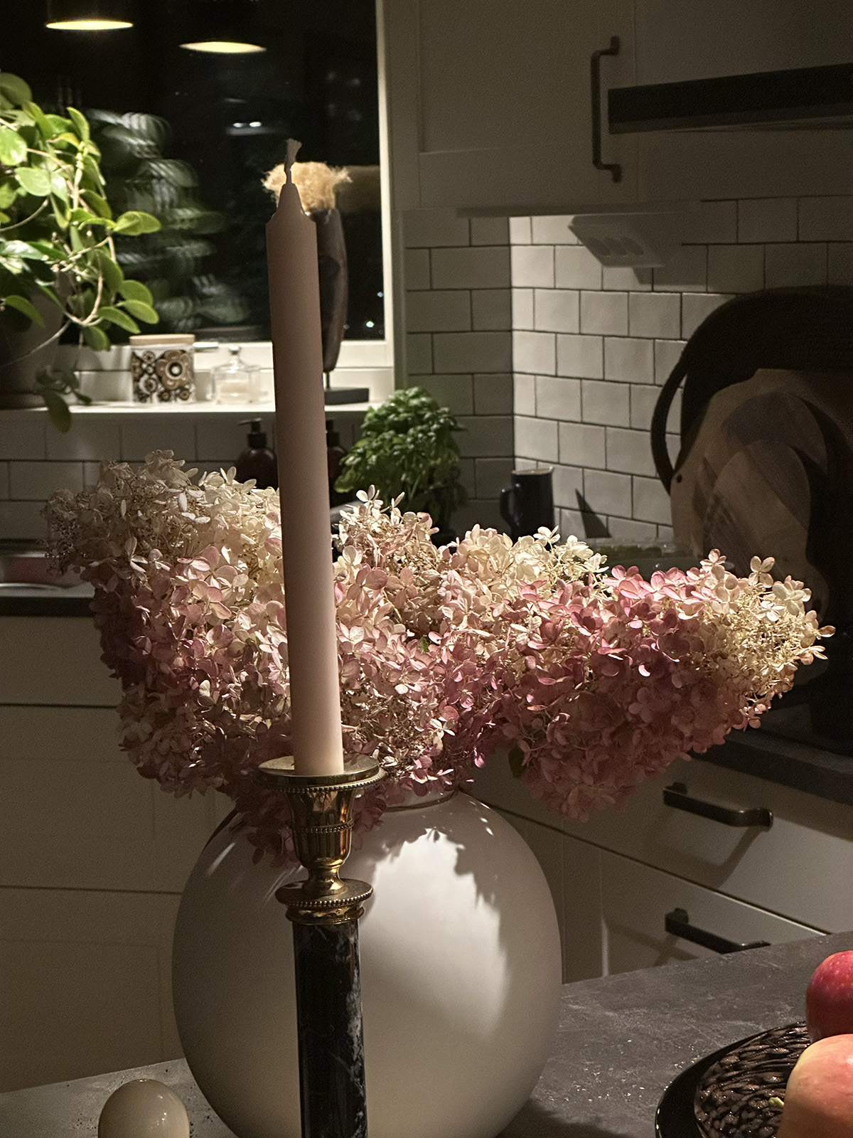 Hortensiakvistarna fick jag hos mamma och pappa när jag var där för några veckor sen. De har en stor buske vid entrén. Glad att kunna klippa några kvistar när tillfälle ges, eftersom jag ännu inte har nån buske själv. De är ju fina länge och när de dör så torkar de ju bara så vackert. Så de står fortfarande kvar där på köksbänken tillsammans med en burk med fudge, som vi fick av barnen (jodå det finns fortfarande några godbitar kvar) och ett sedan länge utbrunnet voluspa-ljus. Asken får komma fram i inredningen emellanåt.