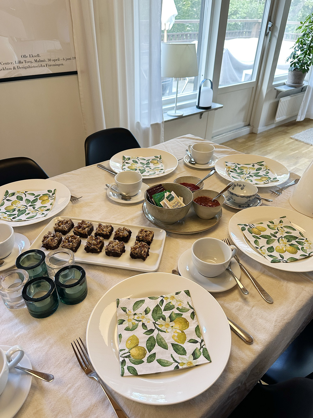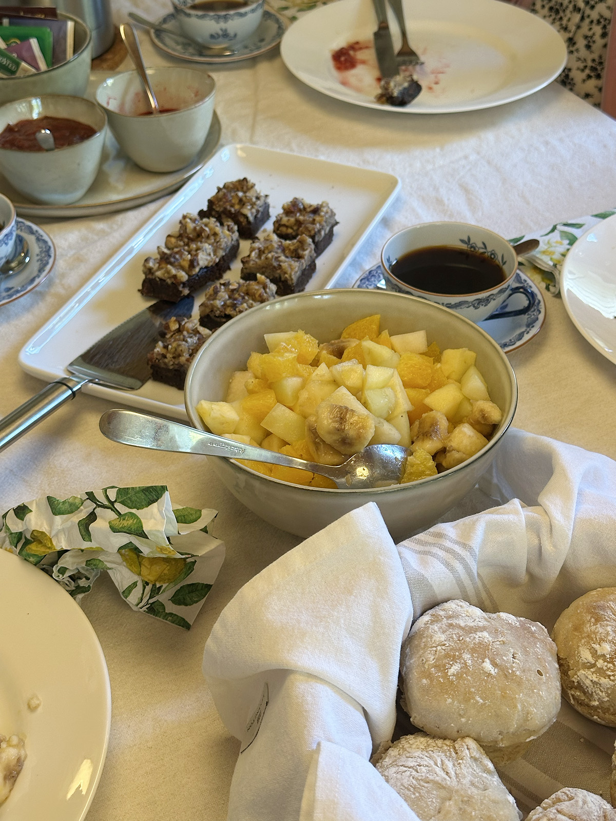 Fruktsallad, nötkaka, färskt hembakt bröd med hallonmarmelad och plommonmarmelad och morotskaka. Jag fick egen morotskaka eftersom jag inte tål citron (och lime) som var i de andras kaka. Så gott och vällagat allting.