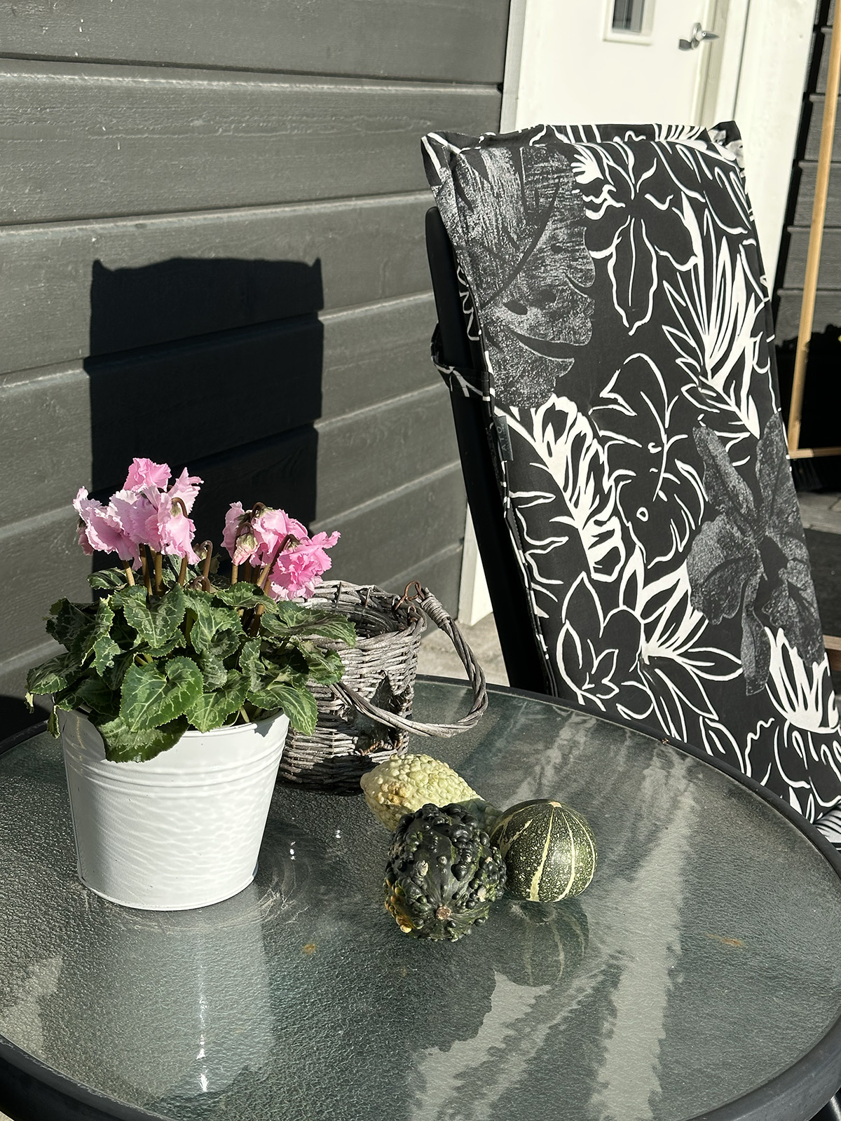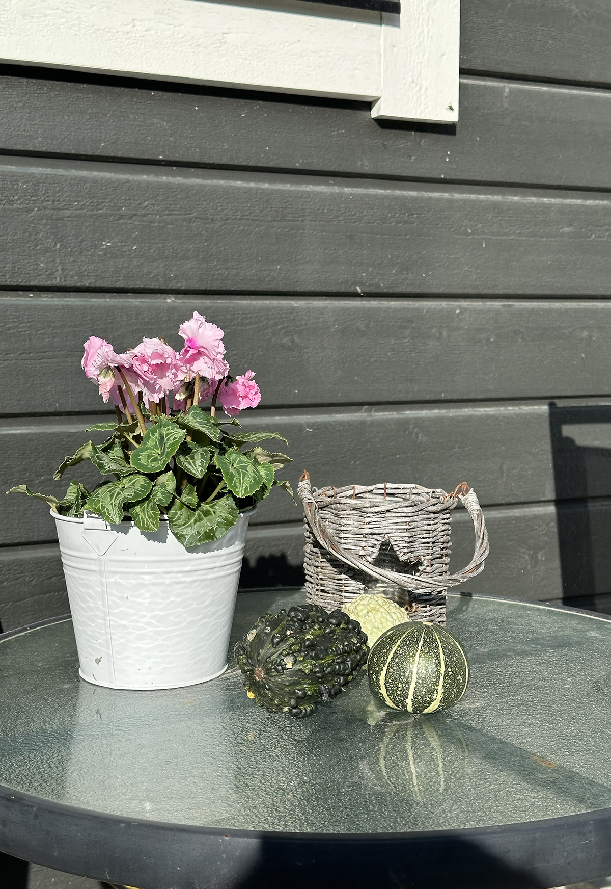 Jag valde en ljusrosa cyklamen med lite krusiga blad. En ny sort för mig. Kan inte minnas att jag sett nån sån förut. Väldigt söt. Och några hitte-på-pumpor gör det hela komplett för att lyfta hösten.