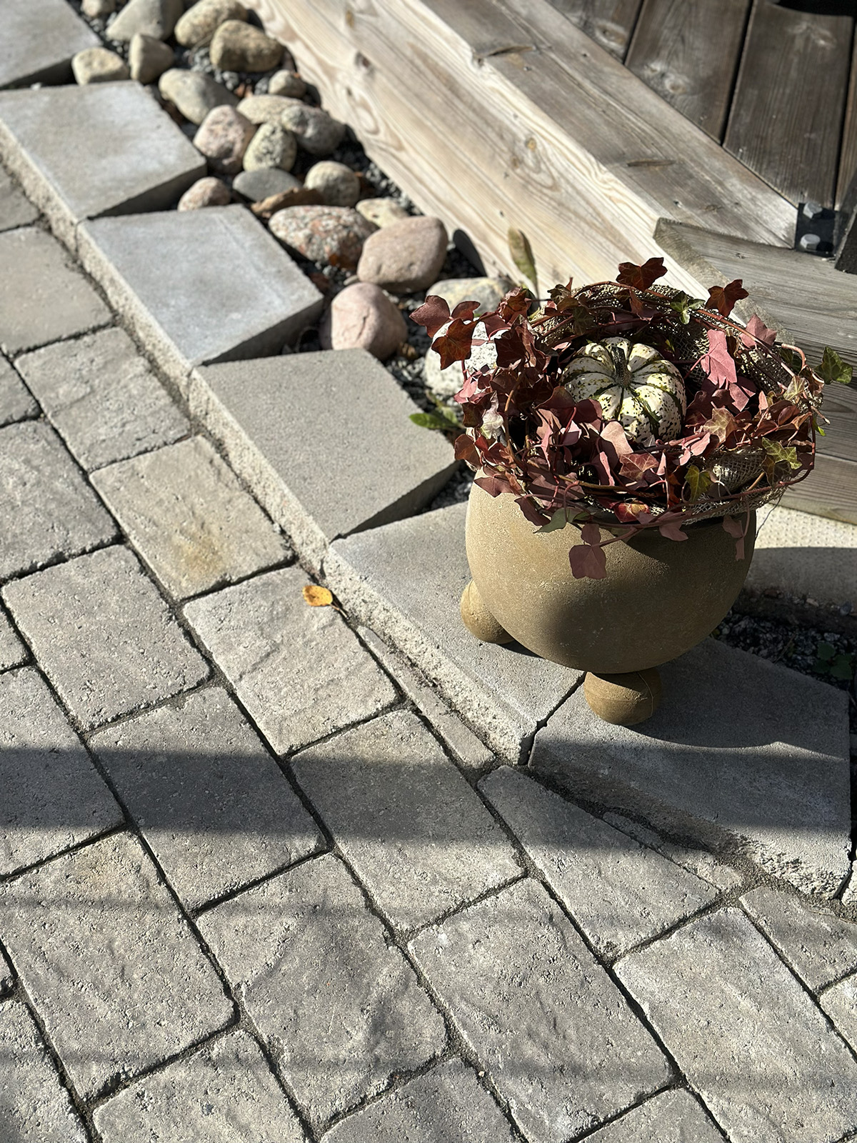 Jag har inte bara fixat höstpynt vid kafébordet, som jag visade härom dagen. Det har även blivit lite hösttouch i den rostiga krukan intill trädäcket. Åh vad jag tycker om den knubbiga krukan.