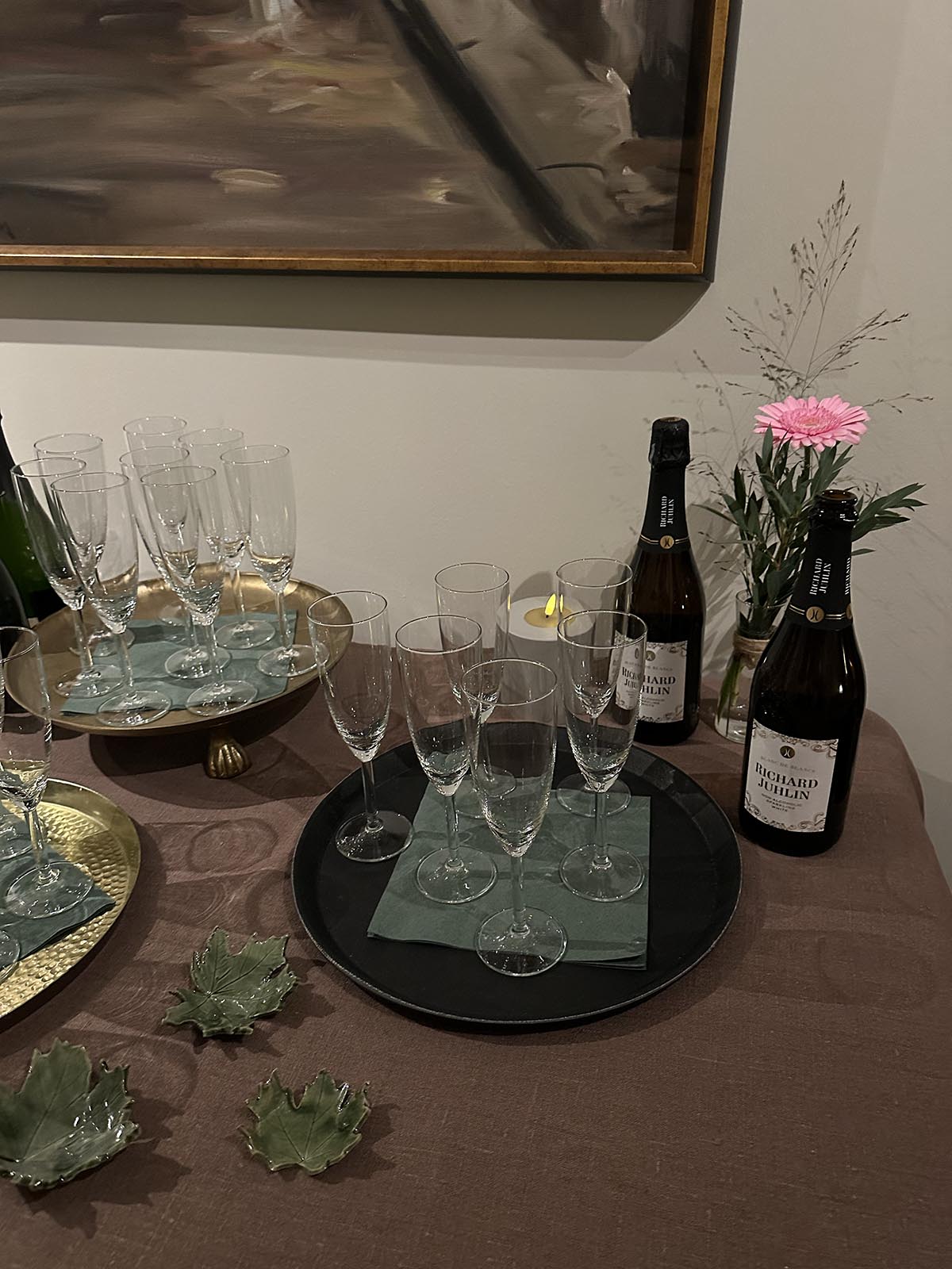 Som välkomstdrink bjöd jag på champagne (Guldkula från Rickards Julin) och alkoholfritt bubbel (även det från Rickard Juhlin) och till det två olika snittar. Från Rum 35A.