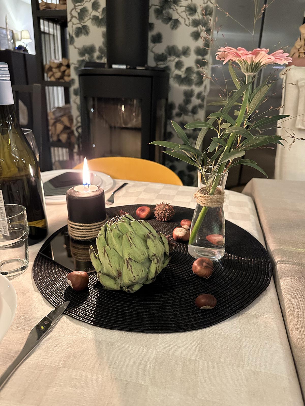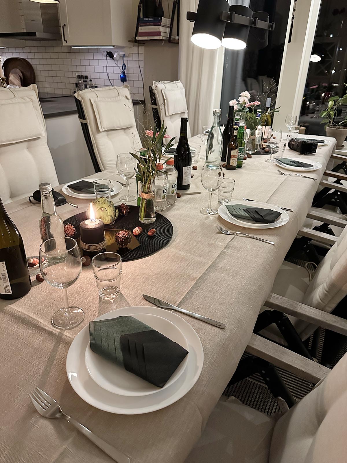 Dukningen blev som vanligt i kontrasternas tecken. Lite finare linnedukar och enklare Ikea-porslin som matchades upp med lite arbetade servettvikningar, vackra buketter i enkla Ikea-vaser piffade med jutesnöre, svarta blockljus med jutesnöre runt (dåliga ICA-ljus som rann jättemycket!) matchades upp med kronärtskockor och kastanjer.