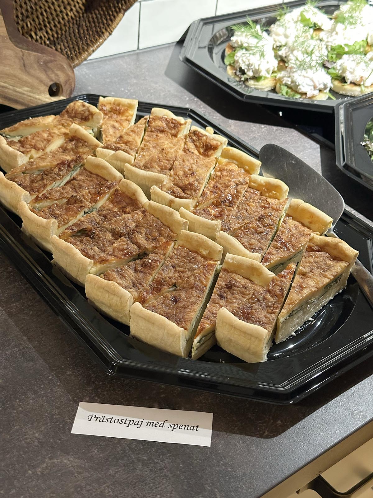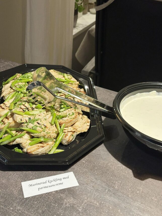 Och maten då. Jag beställde mat från Rum 35A. Valde deras bufféförslag rakt av. Jag skrev in menyn med lite festligt teckensnitt, printade ut och satte på ett par skåpsluckor. Plus små lappar vid faten. Tänkte att det kunde vara lite trevligt att läsa medan man stod i kö.