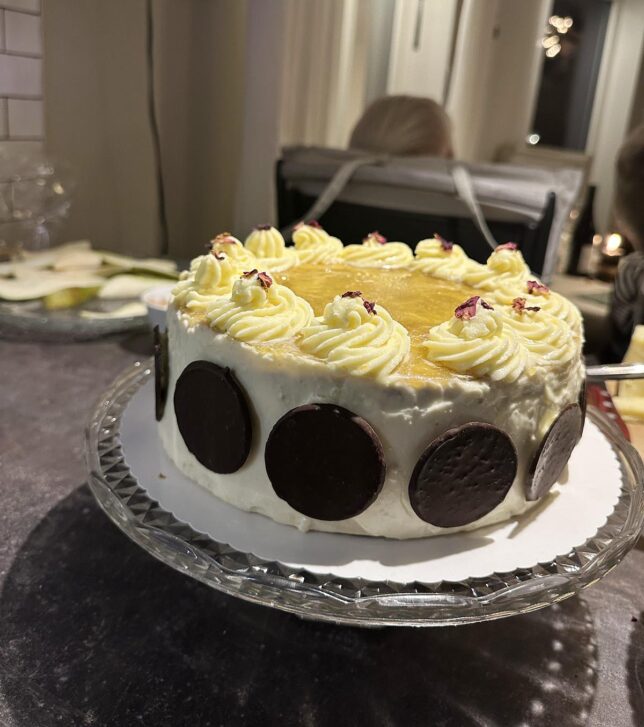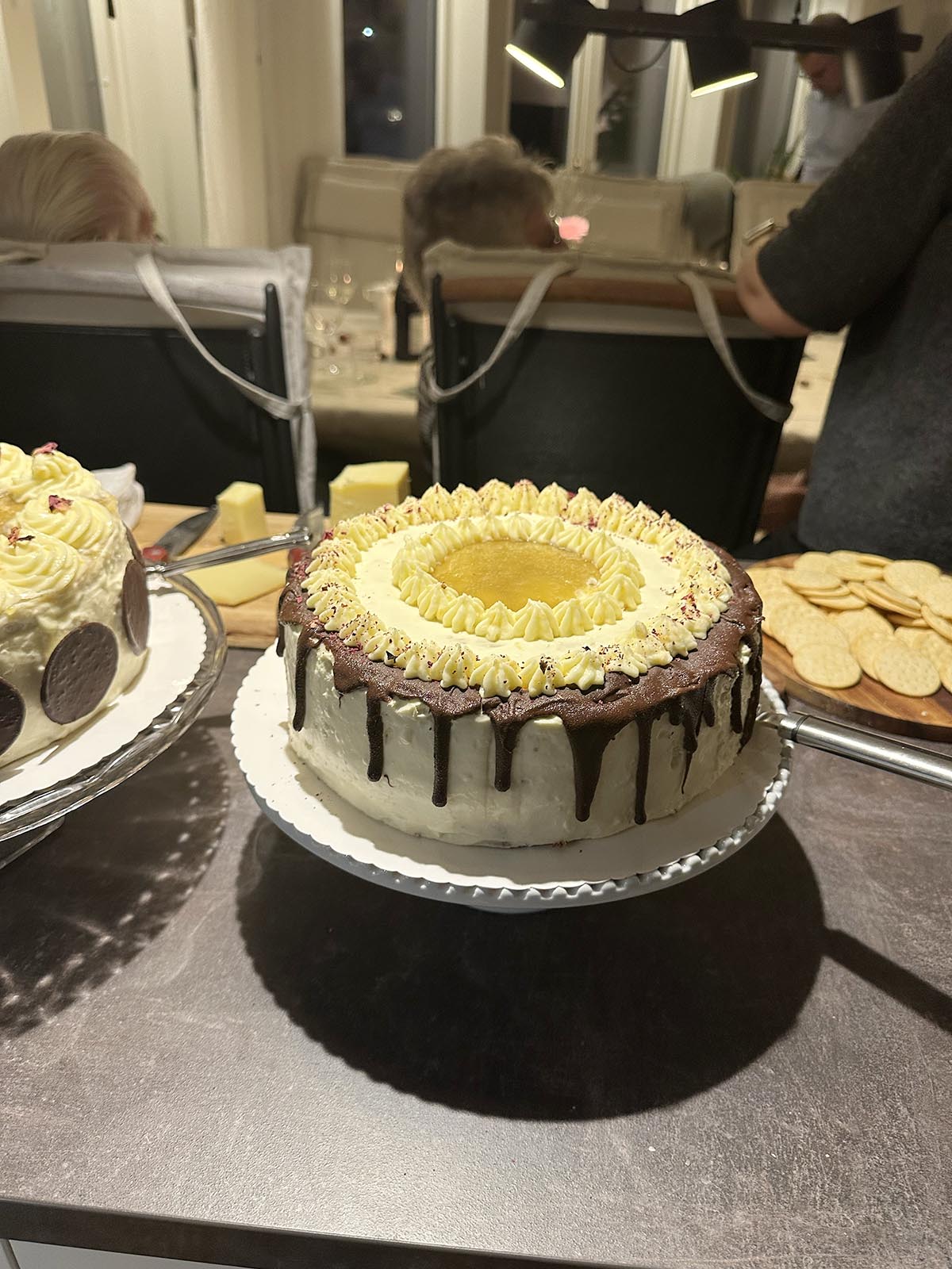 Jamen lyssna på det här då. Nötbotten som sagt, mellanlager var vit chokladmousse med kesella och apelsin-/vaniljkräm. På toppen apelsinjuice med ett slags gelatinpulver. På sidorna pannacotta med flädersmak och rosetterna uppepå var apelsinfrosting. Hon är ”bara” en väldigt duktig amatör och gör ofta tårtor till både sig själv, familj och vänner. Hon kan inte komma på att hon nånsin gjort samma sorts tårta två gånger. Helt otroligt. Inspirationen hämtar hon såklart från tårtornas land Tyskland, där de har sina rötter. Men tack och lov är hennes tårtor betydligt godare än de tyska.