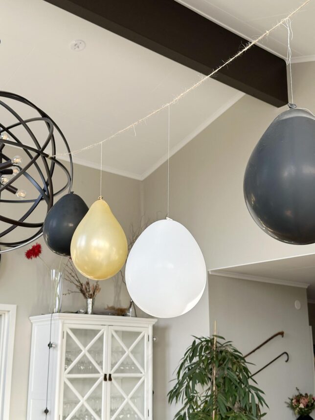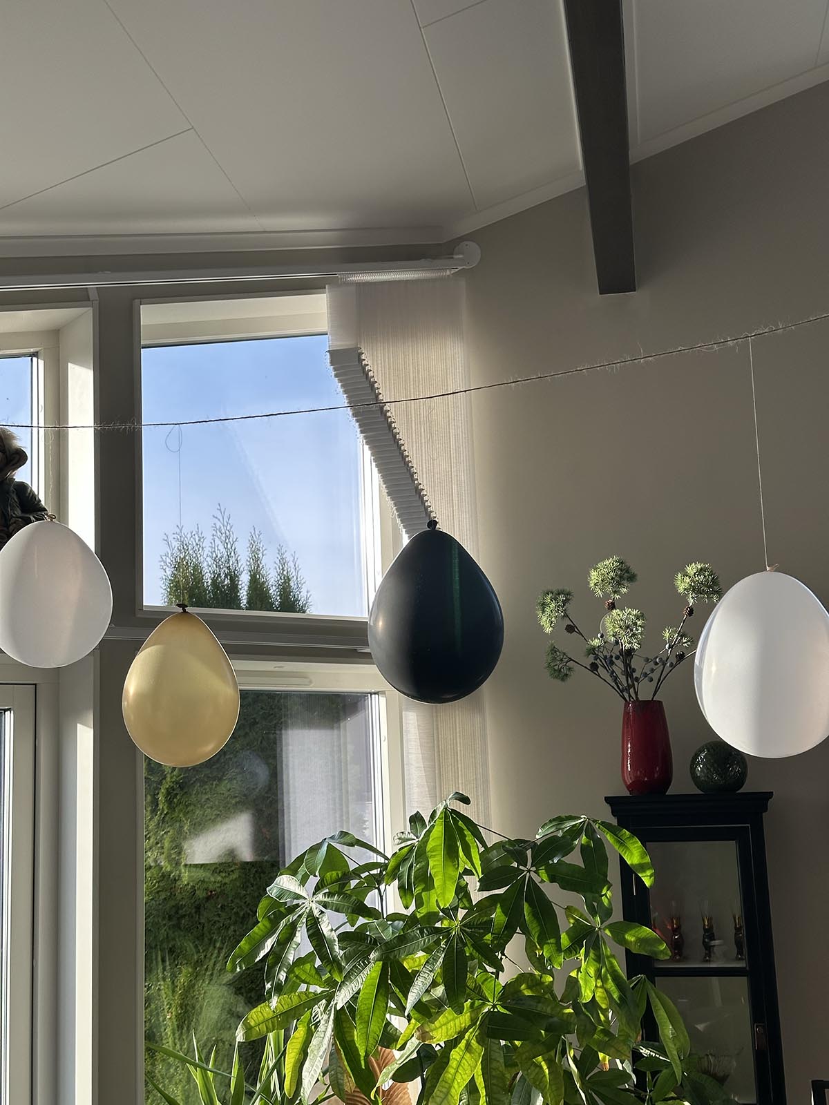 Vi hade lagt en stund på att blåsa upp ballonger, fästa i snöre, och sen fästa i två såna girlanger. Enkelt, men ändå lite festligt.