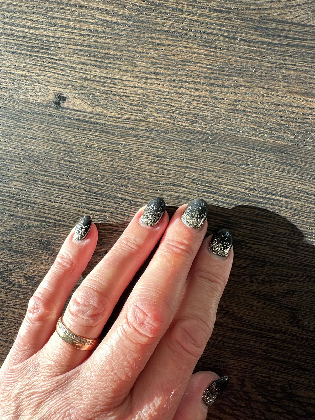 Festnaglar. Ljuset är ju inte det bästa på bilden, men, det är ett svart blankt lack som botten och guldglitter som fade’ar utåt. Enkelt, men ändå lite festligt det också.