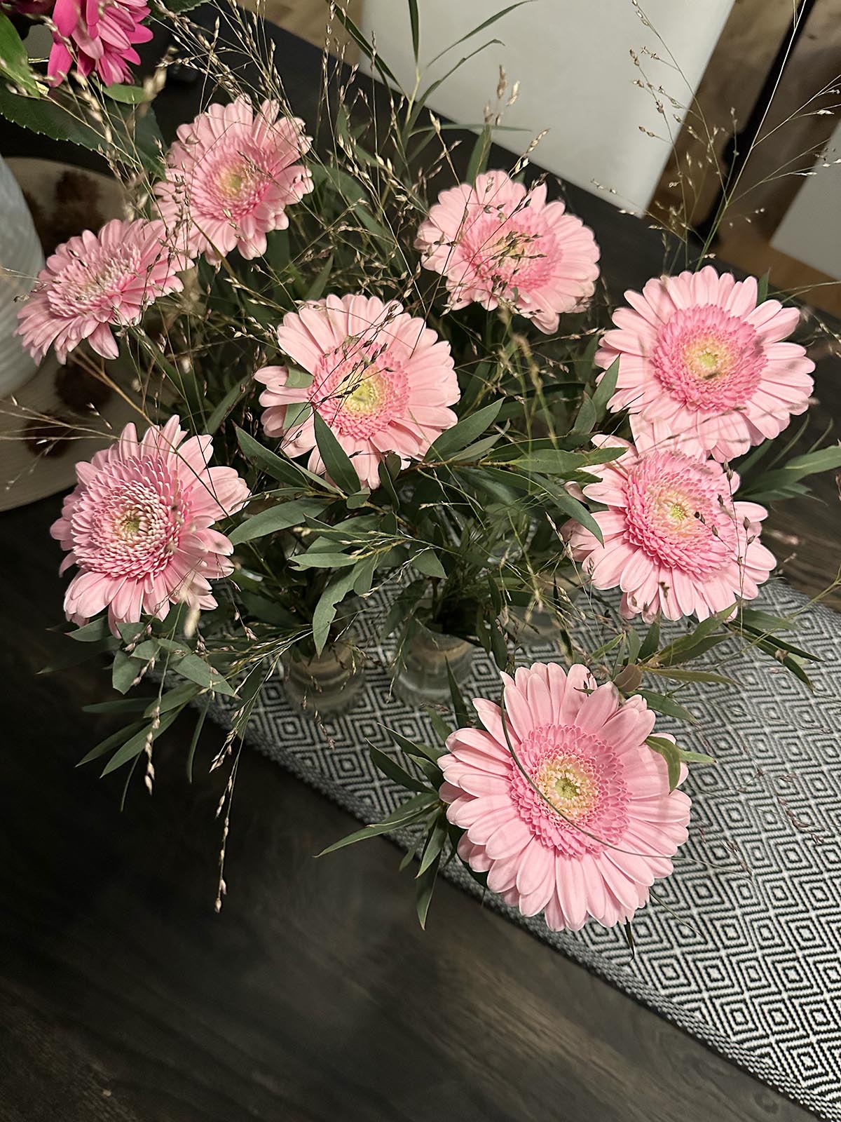 Jag hade dukat med blommor, kronärtskocka, ljus och kastanjer. Jag blev väldigt nöjd med det. Förutom att ljusen rann ner på nya linnedukarna! Köp inte blockljus på Ica!