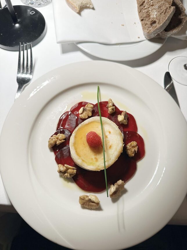 Så var det dags för förrätten. Jag tog gratinerad chèvre med rödbetor, valnötter och honung. Andreas tog tunt skivad rå biff med parmesan. Jag har ju ätit min förrätt hur många gånger som helst. Tycker den är så god. Men den här!!! Det går inte att jämföra över huvud taget. Så vansinnigt god! Andreas var också nöjd.