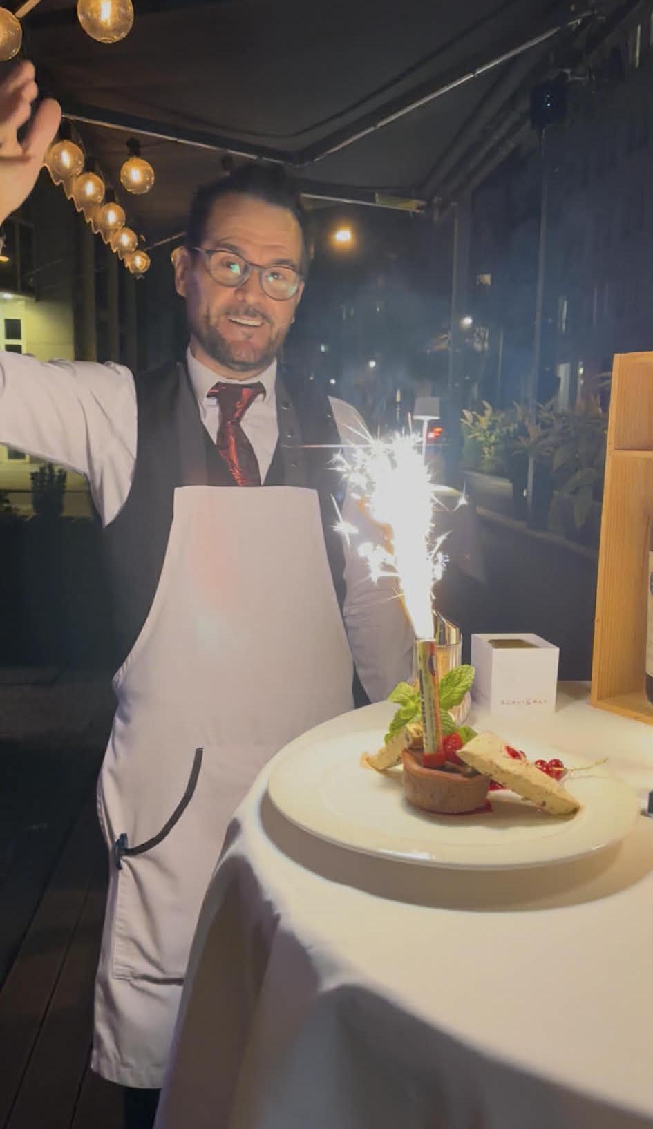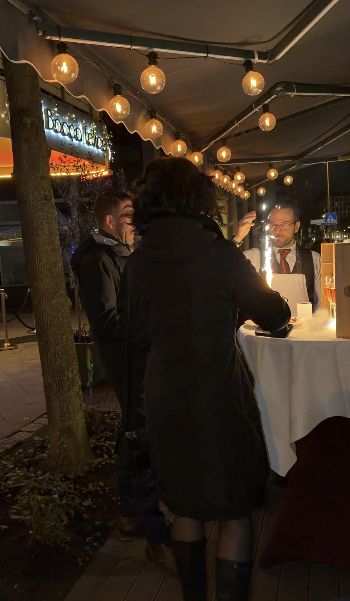 När vår slot-tid för middagen började ta slut så hade vi såklart fortfarande kvar av champagnen. jag frågade om vi kunde flytta ut till ståborden vid entrén. Javisst, sa servitören. Jag kan bära ut åt er. Vi klädde på oss och gick ut och han bar ut champagnen. Efter nån minut så kom en annan servitör med bloss och en liten dessert att dela på (som de bjöd på) och sjöng ”Happy birthday” på italienska, som värsta operasångaren. Hans kollega filmade och skickade filmen till Andreas.