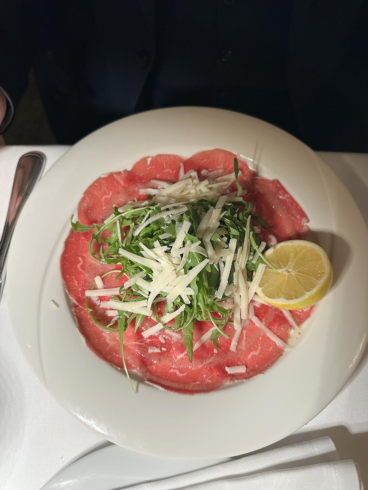 Så var det dags för förrätten. Jag tog gratinerad chèvre med rödbetor, valnötter och honung. Andreas tog tunt skivad rå biff med parmesan. Jag har ju ätit min förrätt hur många gånger som helst. Tycker den är så god. Men den här!!! Det går inte att jämföra över huvud taget. Så vansinnigt god! Andreas var också nöjd.