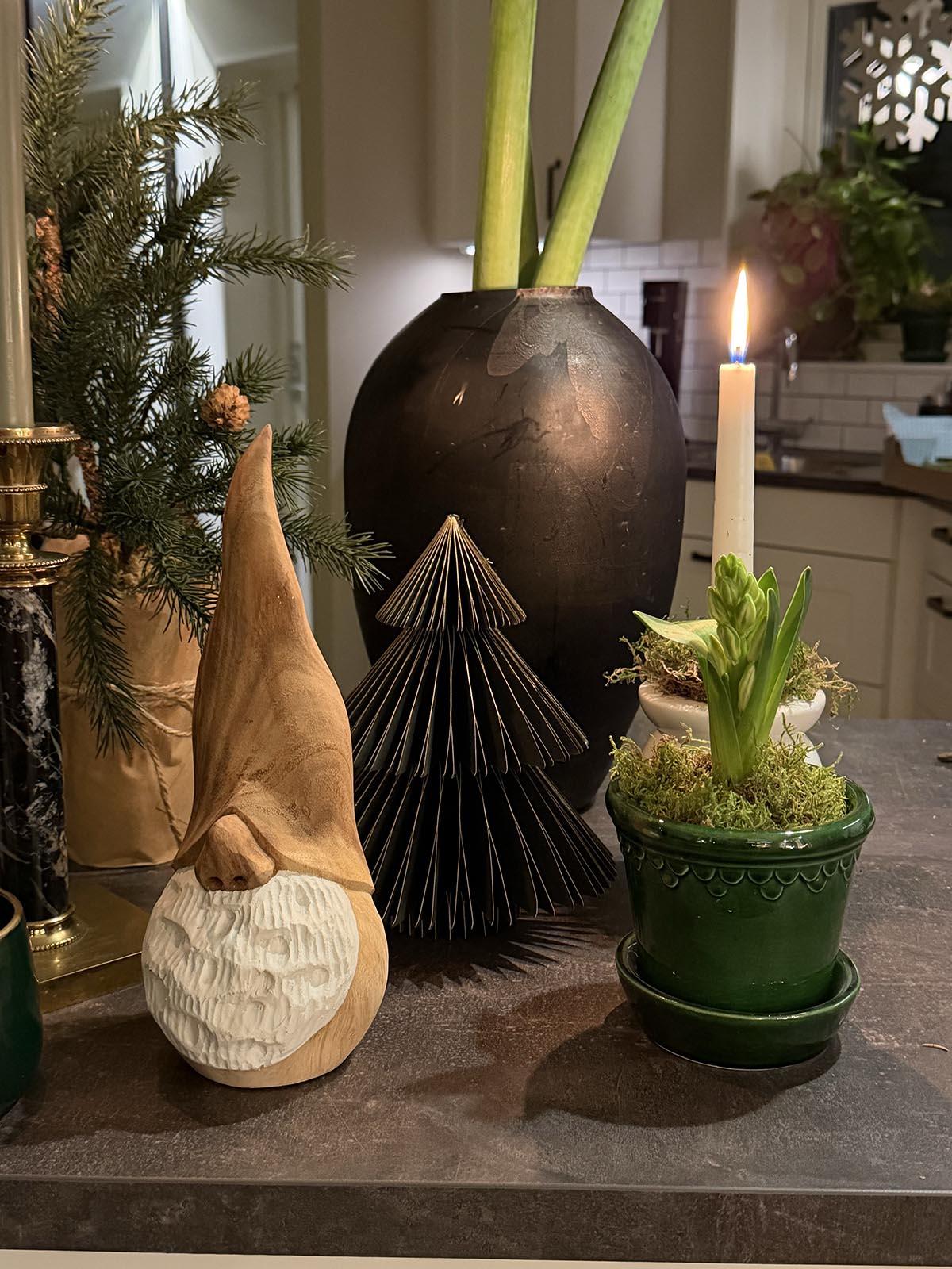 Inget nytt pynt i år. Men jag har gjort en liten pynthörna på köksbänken. Den ser olika ut varje år, så det blir som nytt iallafall. Ett väldigt enkelt sätt att spara på pengar och miljö. Fast visst, blommorna är ju färska så lite belastning blev det ju allt.
