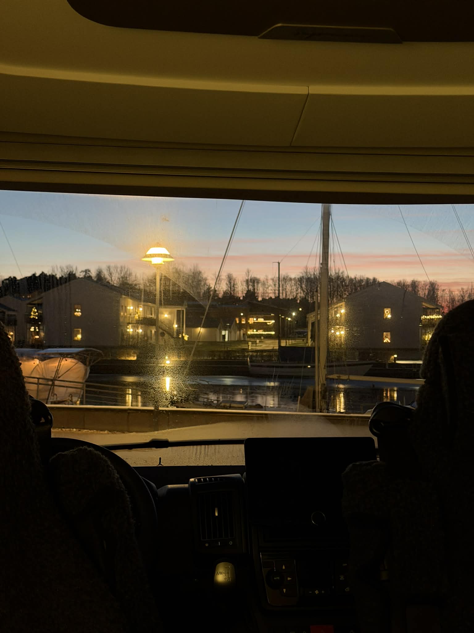 Det var vindstilla hela dagen. Mot eftermiddagen började det blåsa lite. Vi fick väl känna yttersta kanten av stormen Johannes. Vi hade tänkt grilla korv på Atagon, men Andreas är säkerhetmedveten så han ville inte äventyra att några lågor blåste in i vår eller grannens husbil. Man visste ju inte om blåsten skulle öka. Vi stekte korven inne istället och tog det sen väldigt lugnt. Jag fixade med dagens bilder och Andreas fixade med projektorn.