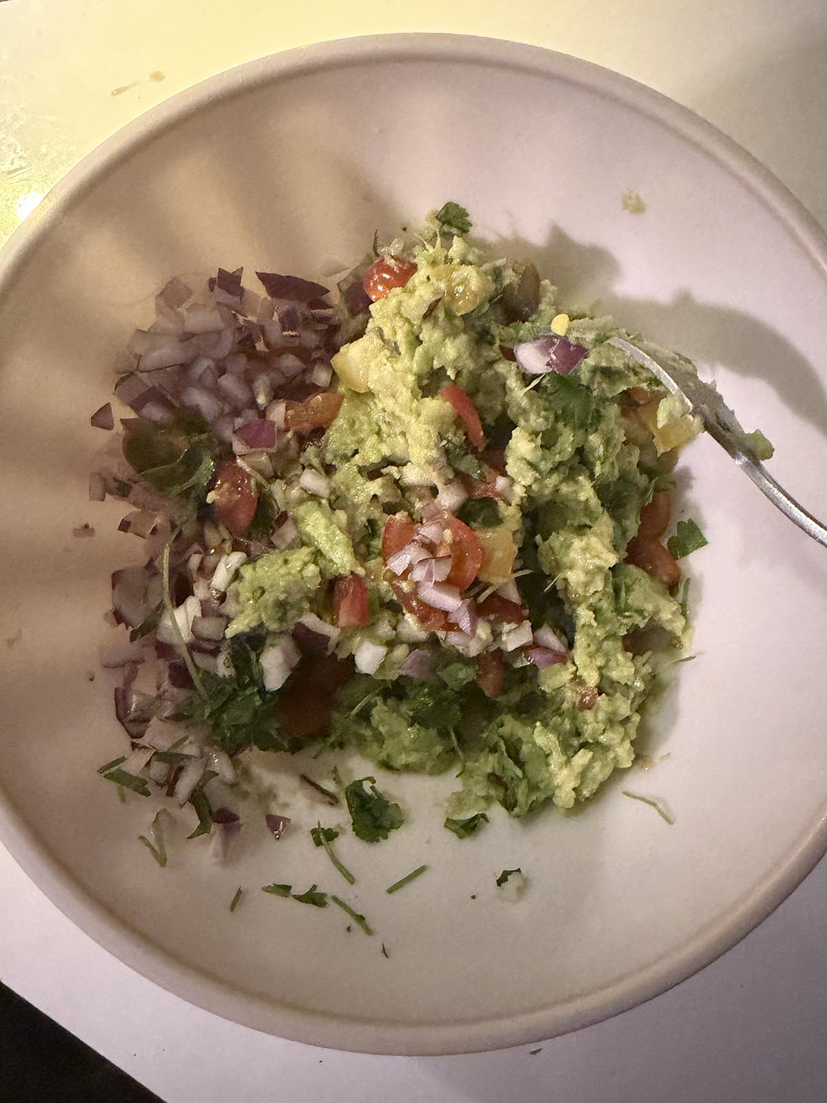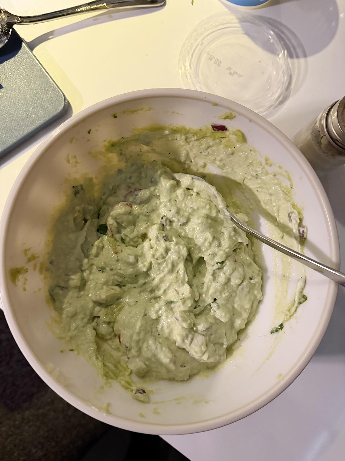 Kryddade på med svartpeppar och ordentligt med salt. Man ska egentligen ha limesaft också, men eftersom jag är allergisk så hoppade vi över det. Och blandade runt till en härlig gegga. 🙂