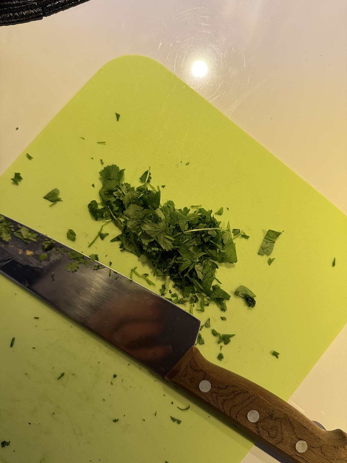 Vi hjälptes åt att hacka en 1/2 liten rödlök, färsk koriander till ett par matskedar och 10 små tomater.