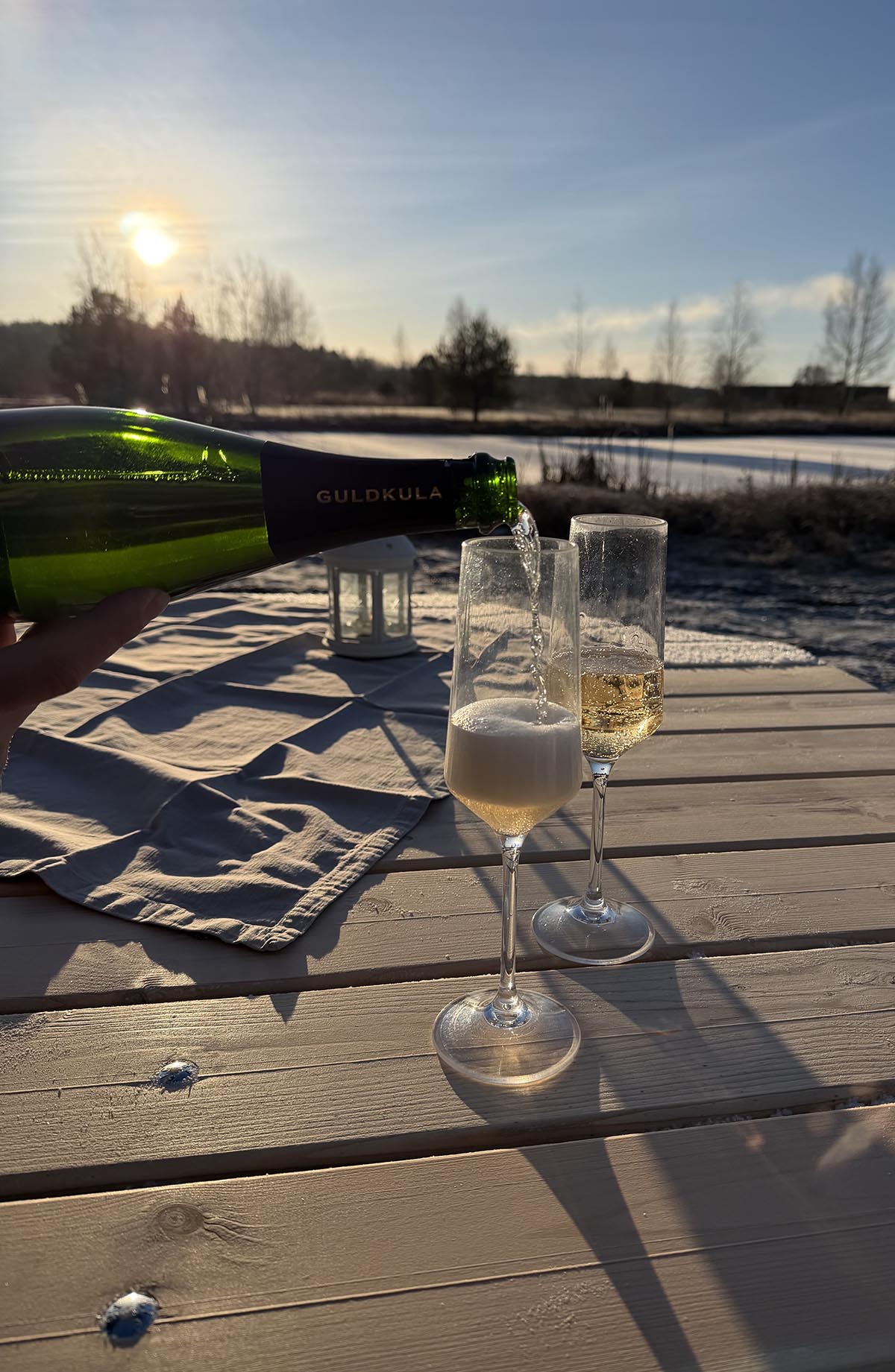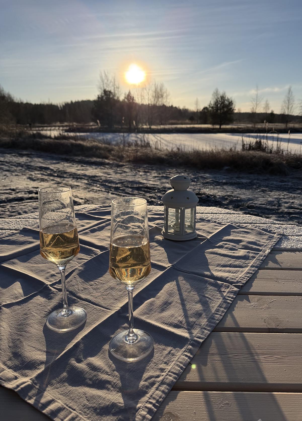 Vi slog läger. På med förstärkningsjackorna under skaljackorna. Tog fram underlag och fällar att sitta på. Ut med en duk och ljuslykta och hällde upp ett varsitt glas champagne. Det var så härligt. De andra åren brukar vi vilja dricka champagnen ganska snabbt för att sen ta fram maten och gå hem, eftersom det brukar vara så ruggigt. Men igår satt vi länge och bara njöt. Det märktes att folk har längtat efter fint väder. Ovanligt många var ute på promenad. Några önskade god fortsättning och några tyckte det såg mysigt ut där vi satt.