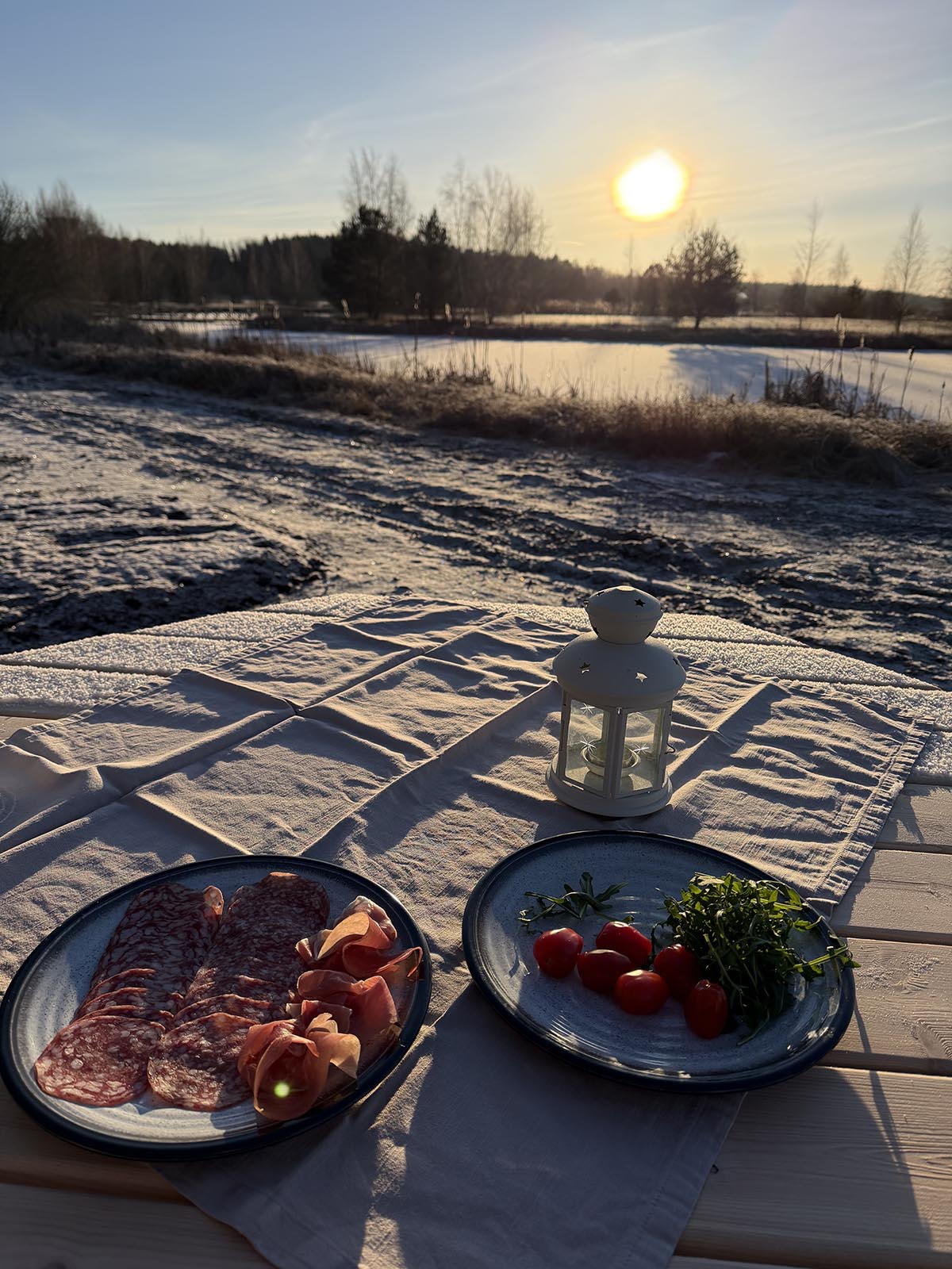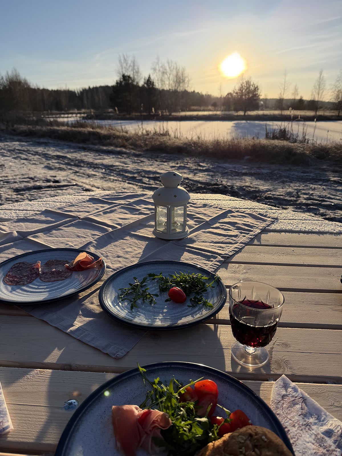 Vi hade tagit med oss lite skinka, salami, grönsaker och lite rött. Salladen blev rätt krispig efter ett tag kan jag säga, hehe. Vinet hade jag lindat in i en handduk för att det inte skulle bli för kallt. Och brödet, som var värmt hemma, var inlindat i folie, tidningspapper och handduk. Så det var faktiskt lite ljummet när jag tog fram det.