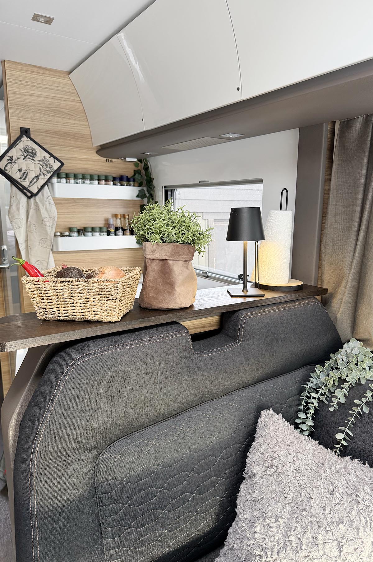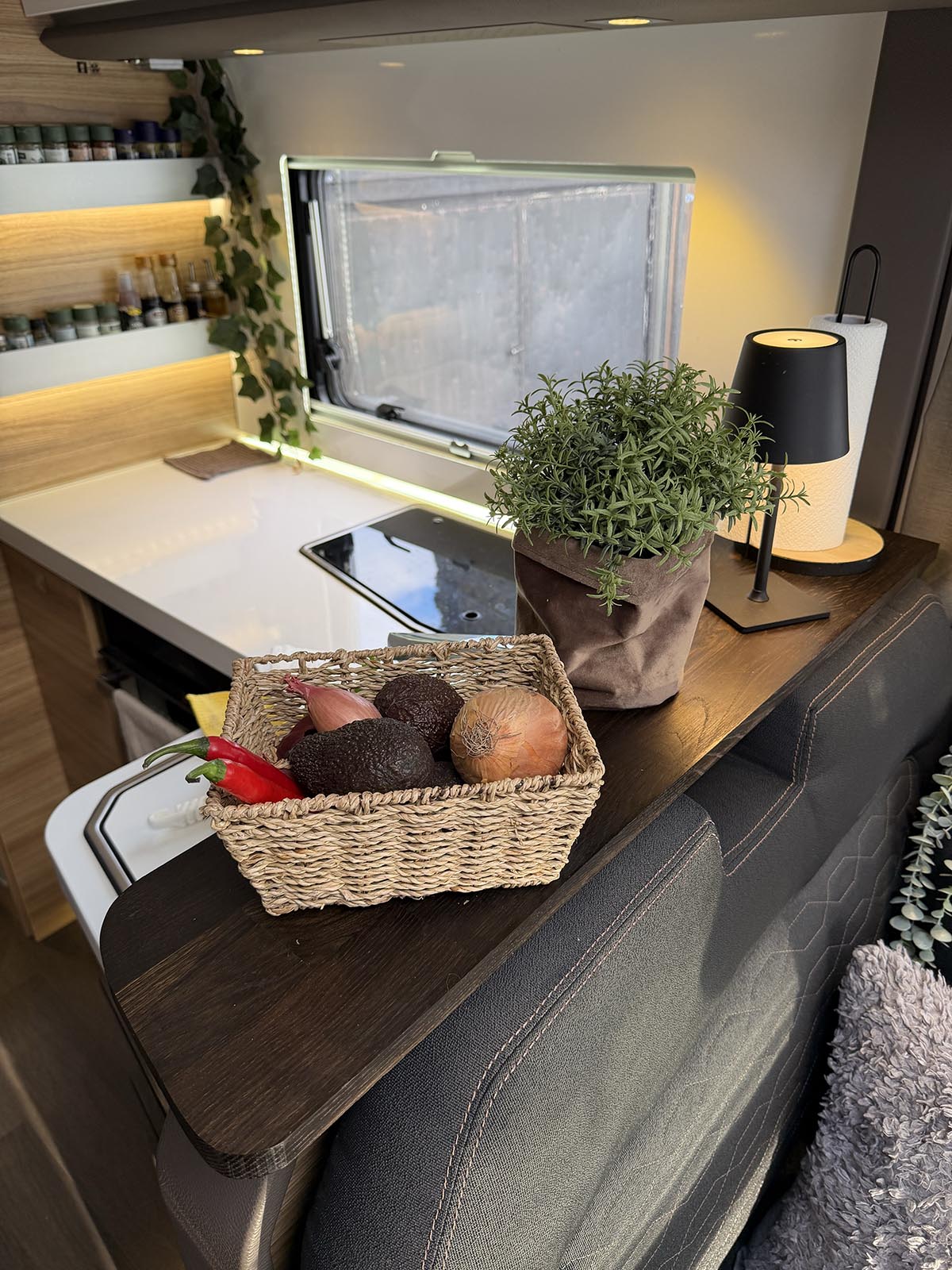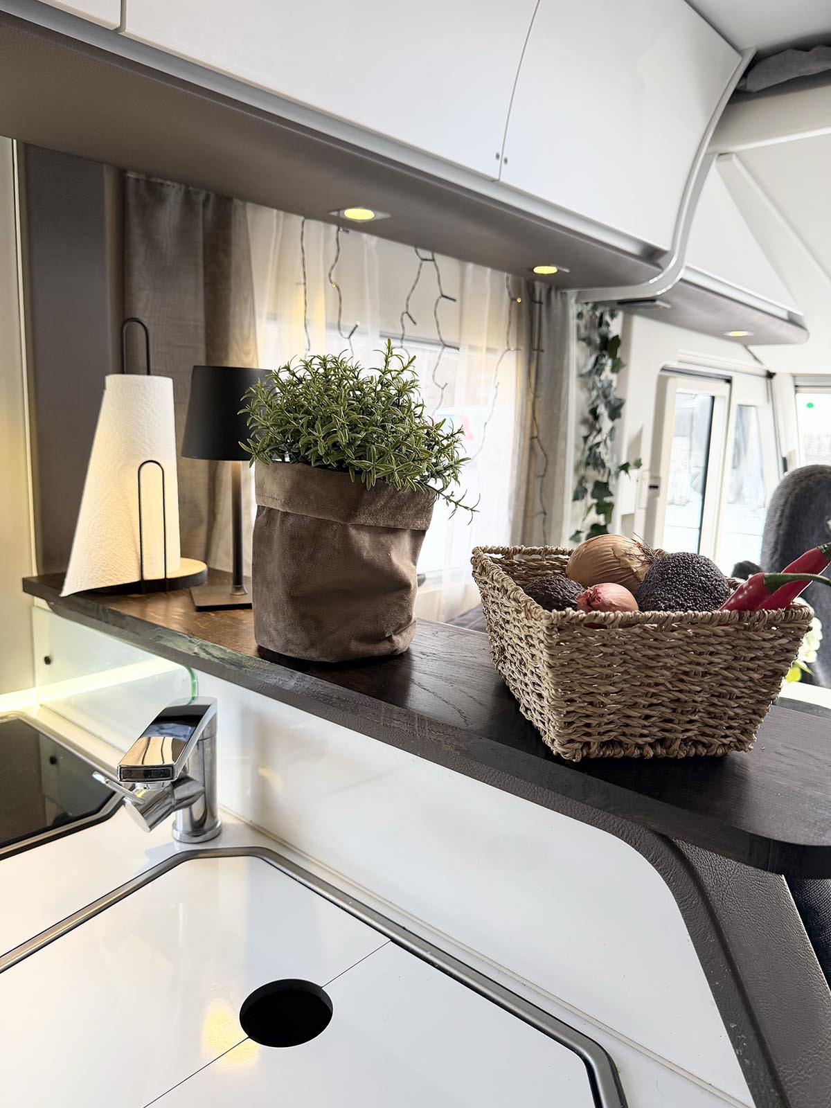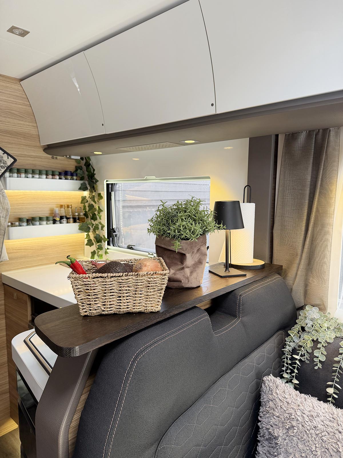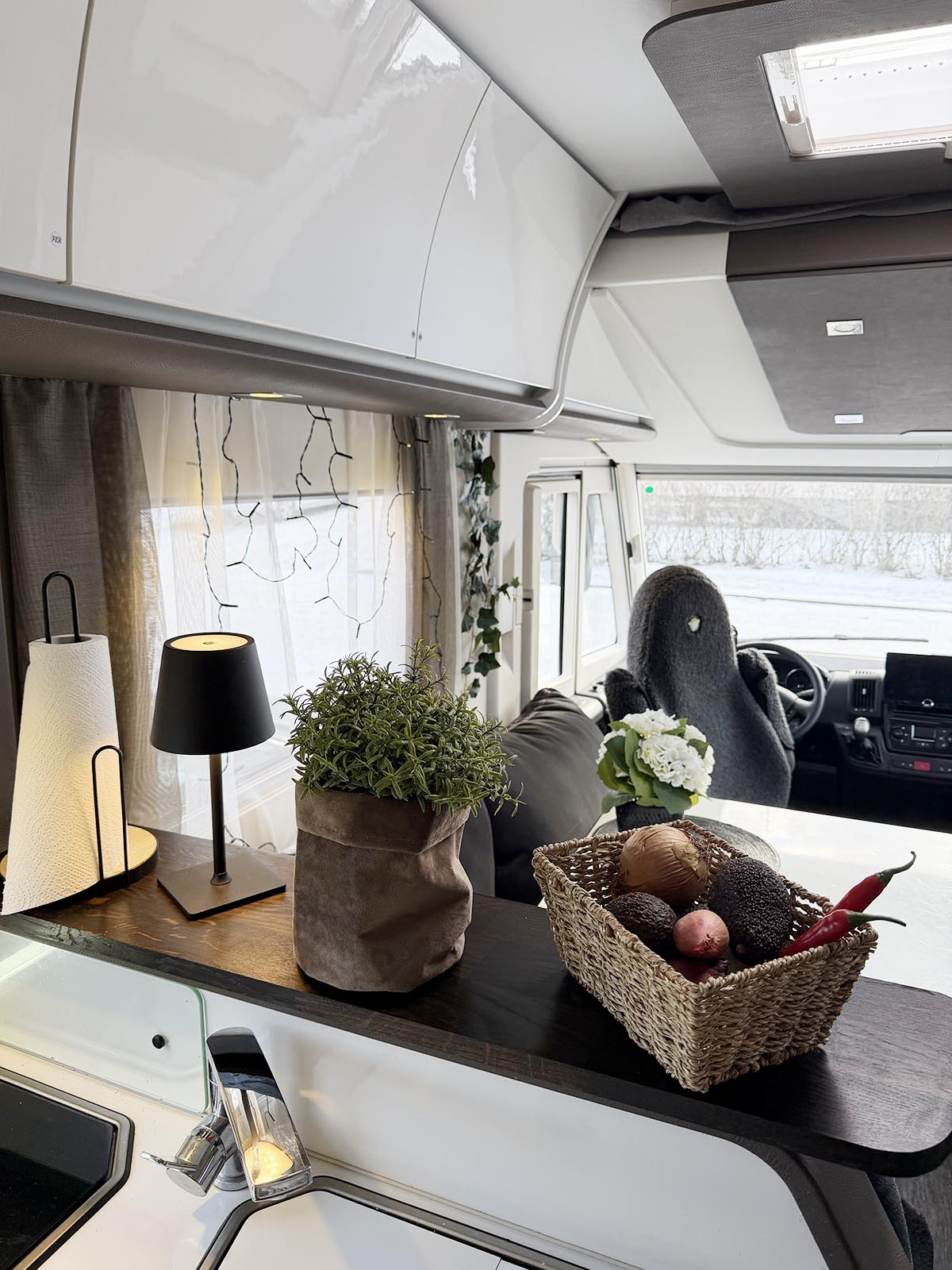 Det är lite trevligt med pynt även i husbilen tycker jag. När det är dags för matlagning kan man flytta ihop sakerna lite så man får plats med nån skål eller fat. Skönt att ha en hylla för avlastning i vilket fall.