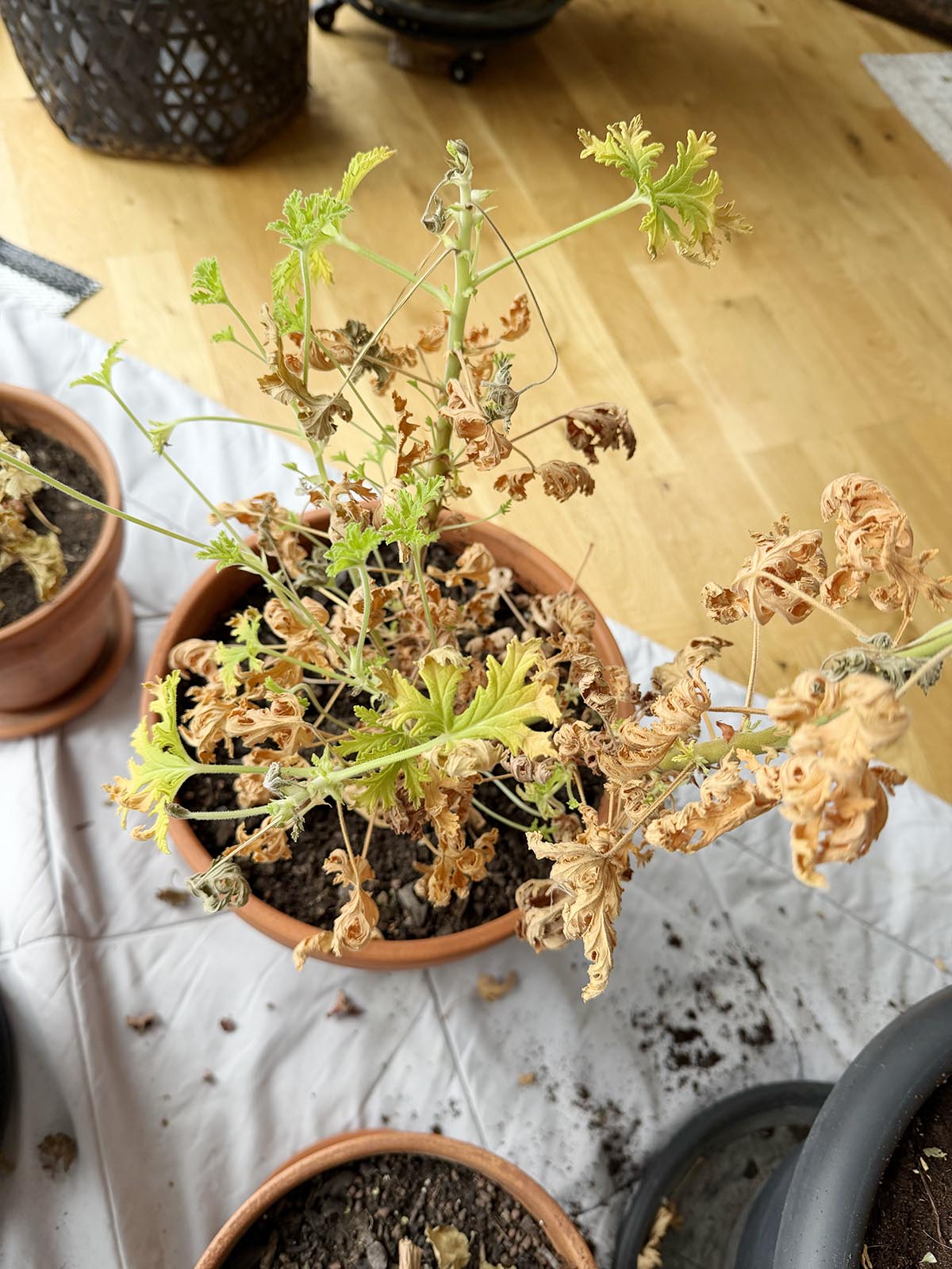 Jag bar in alla krukor från uthuset och ställde de på täcket vi har innanför dörren när vi ska bada i spabadet för att inte blöta ner.