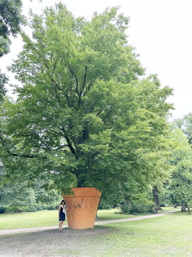 Mellan ställplatsen och centrum finns den fina slottsparken. Där var man ju bara tvungen att fota den roliga ”blomkrukan” som de satt runt ett träd.