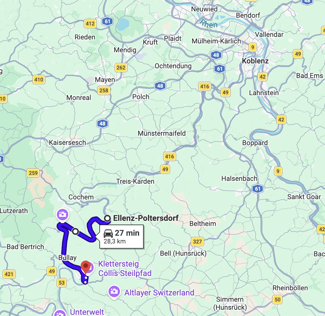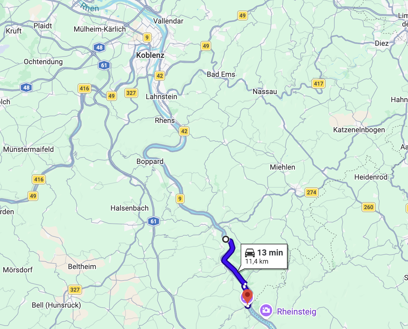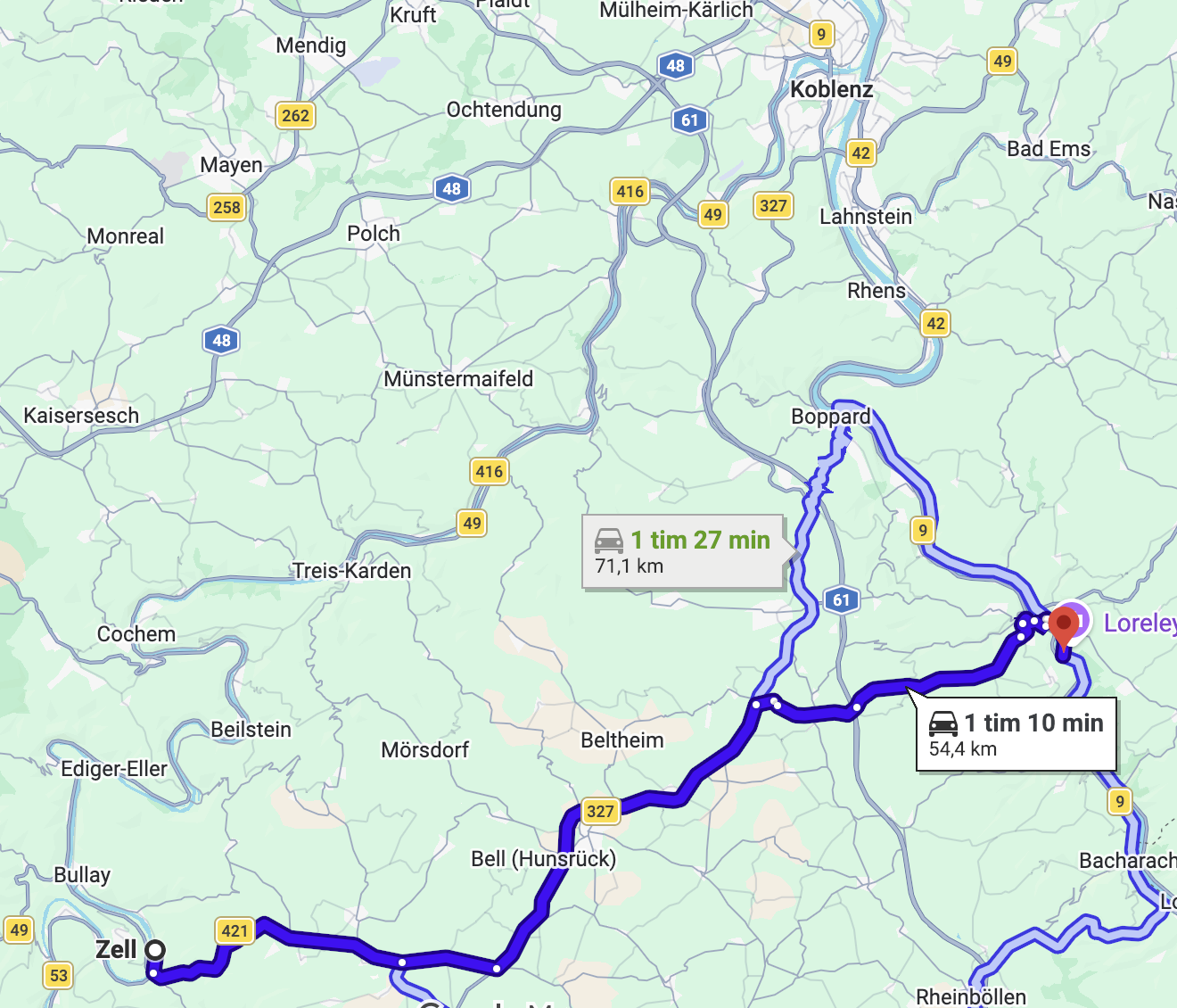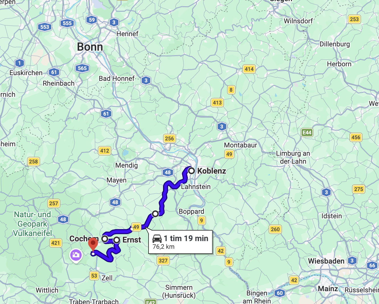 Kör man fyra timmar med husbil sydväst om Buchenwald så kommer man till Koblenz. En stad som var ett av huvudmålen med resan. Men vi stannade för att övernatta längs vägen. Vi hittade en jättefin gratis ställplats. Det kan du läsa om här.