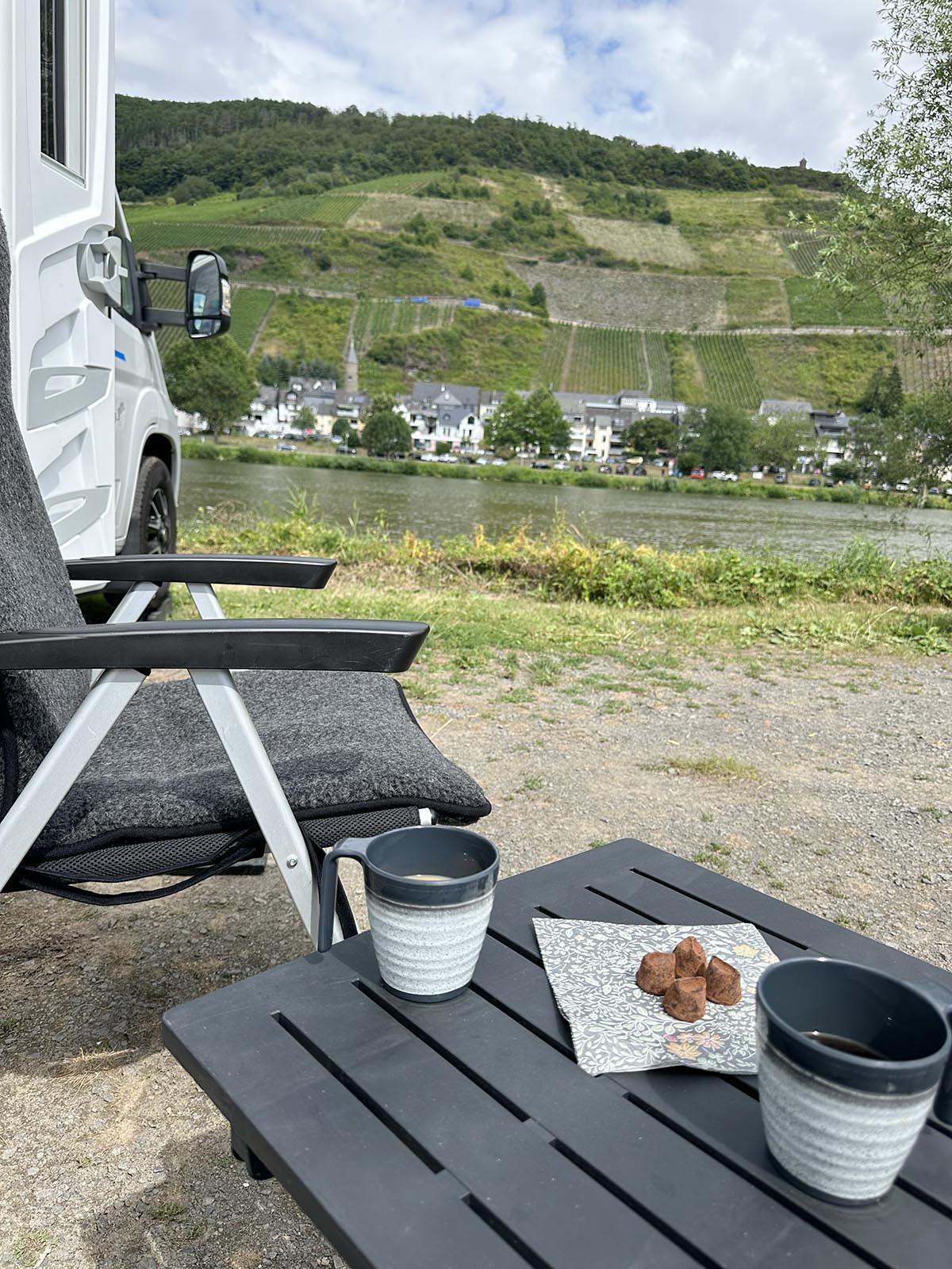 Till sist fick vi ge upp och tråckla oss ut därifrån. Vi bestämde oss för att söka upp ställplatsen vi sett på Park4night först och installera oss. Och sen testa att gå tillbaka över floden till vingården i byn. Vi tog en fika med praliner som vi vunnit på husbilsträffen i Borås lite tidigare. En väldigt enkel ställplats (har för mig den kostade 12 eller 14 Euro), men väldigt vacker utsikt över floden, byn och vinodlingarna. Intill ställplatsen fanns även en camping för de som föredrar det.