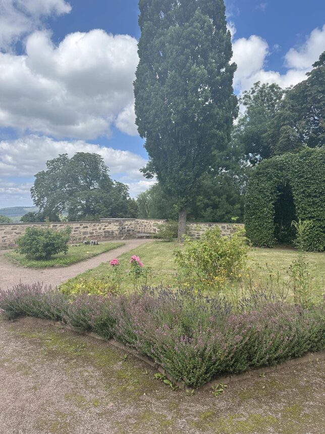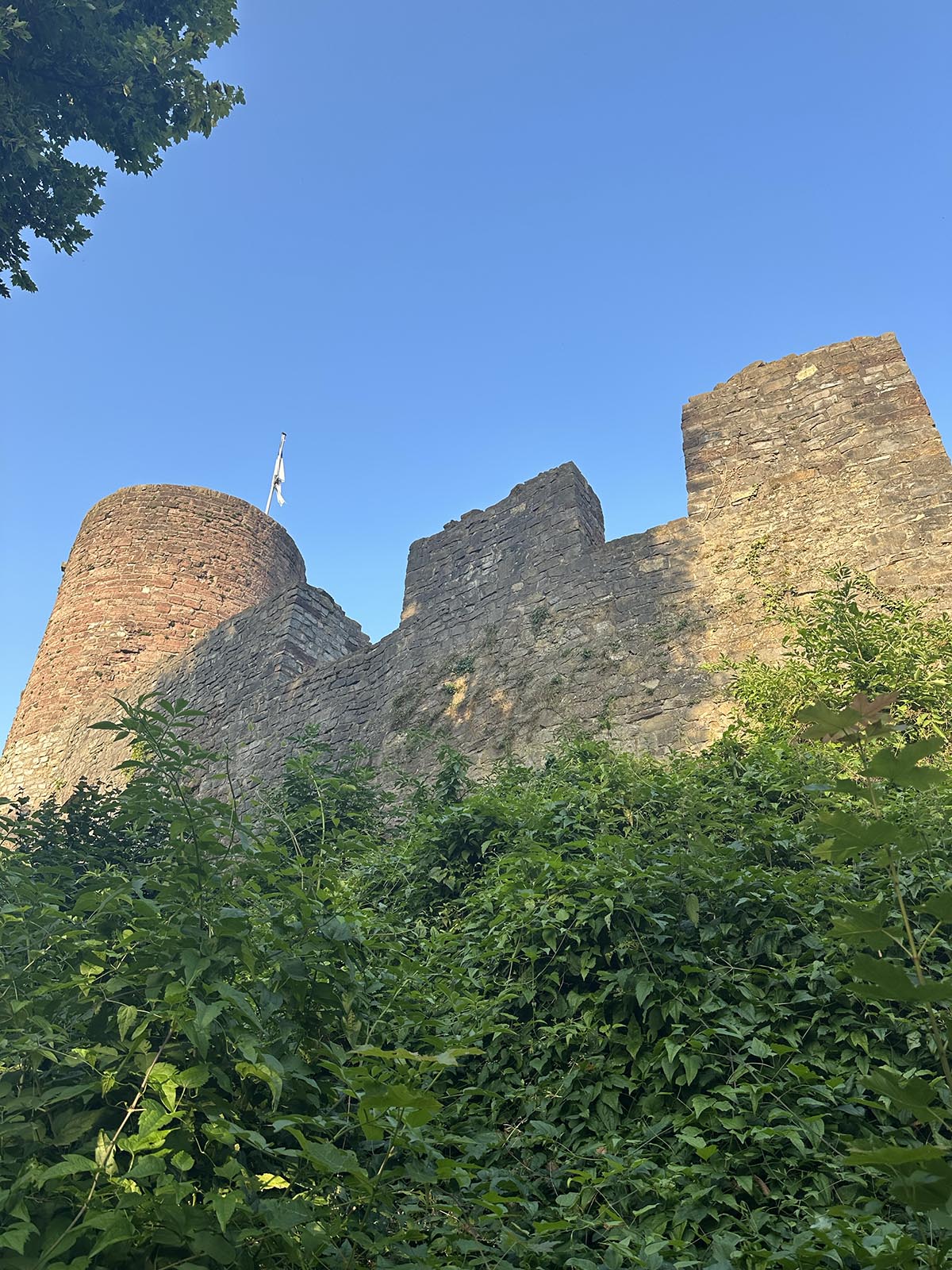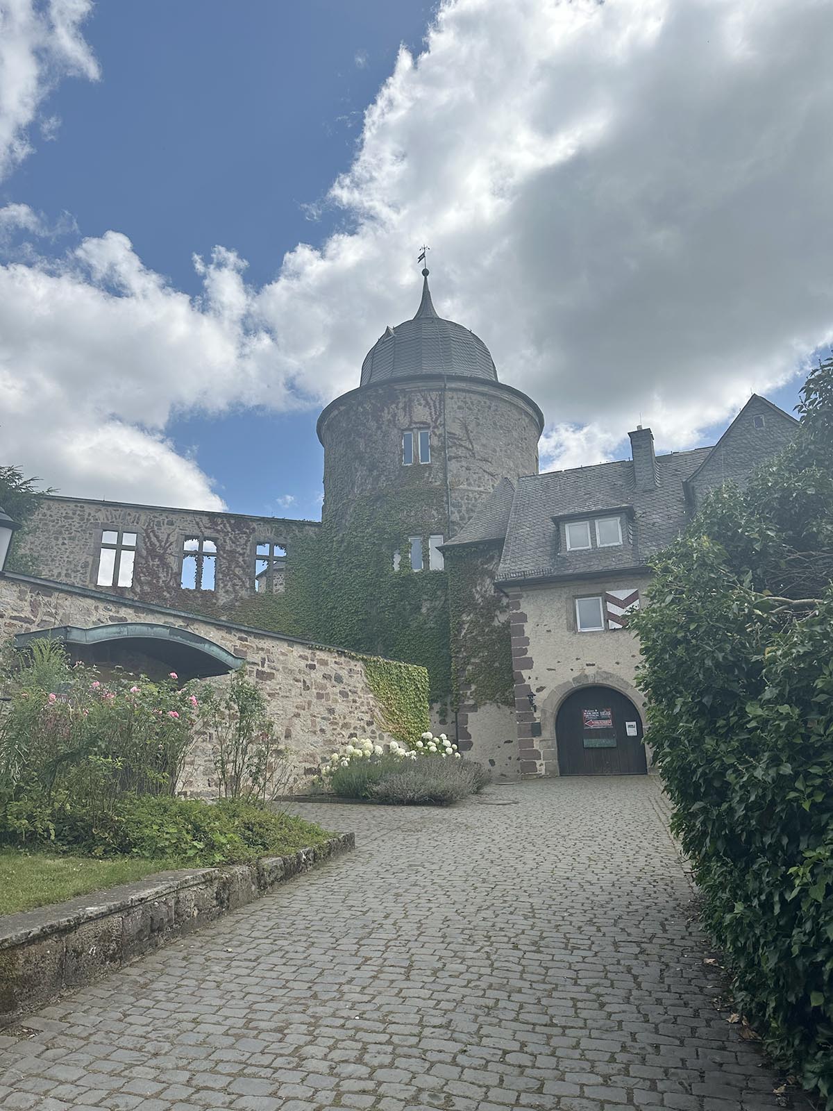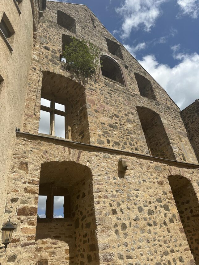 Efter en promenad på några hundra meter (om jag minns rätt) upp längs kullen från parkeringen så nådde man ruinen som sägs ha varit inspiration för Bröderna Grimms saga om Törnrosa. Här har de korta teaterföreställningar sommartid.