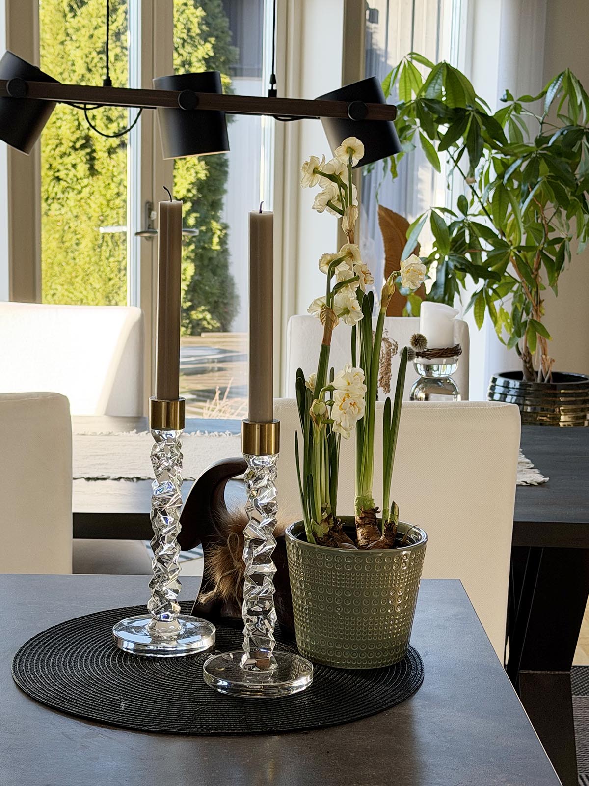 Nu har vi verkligen vårkänslor i vårt hem. Vårsolen glider lätt in genom alla fönster och fyller huset med ljus och ett par vårlökar har fått komma in.