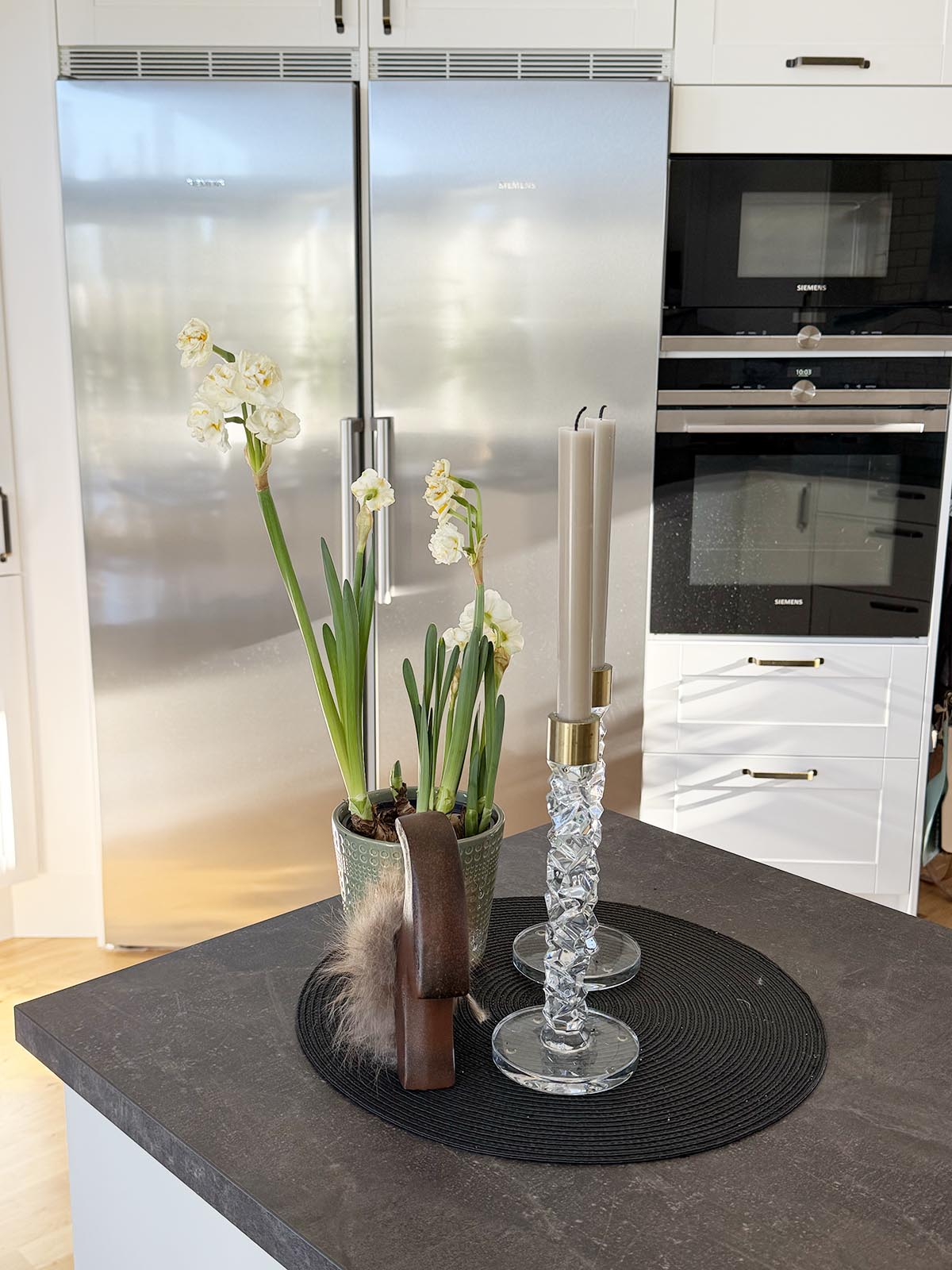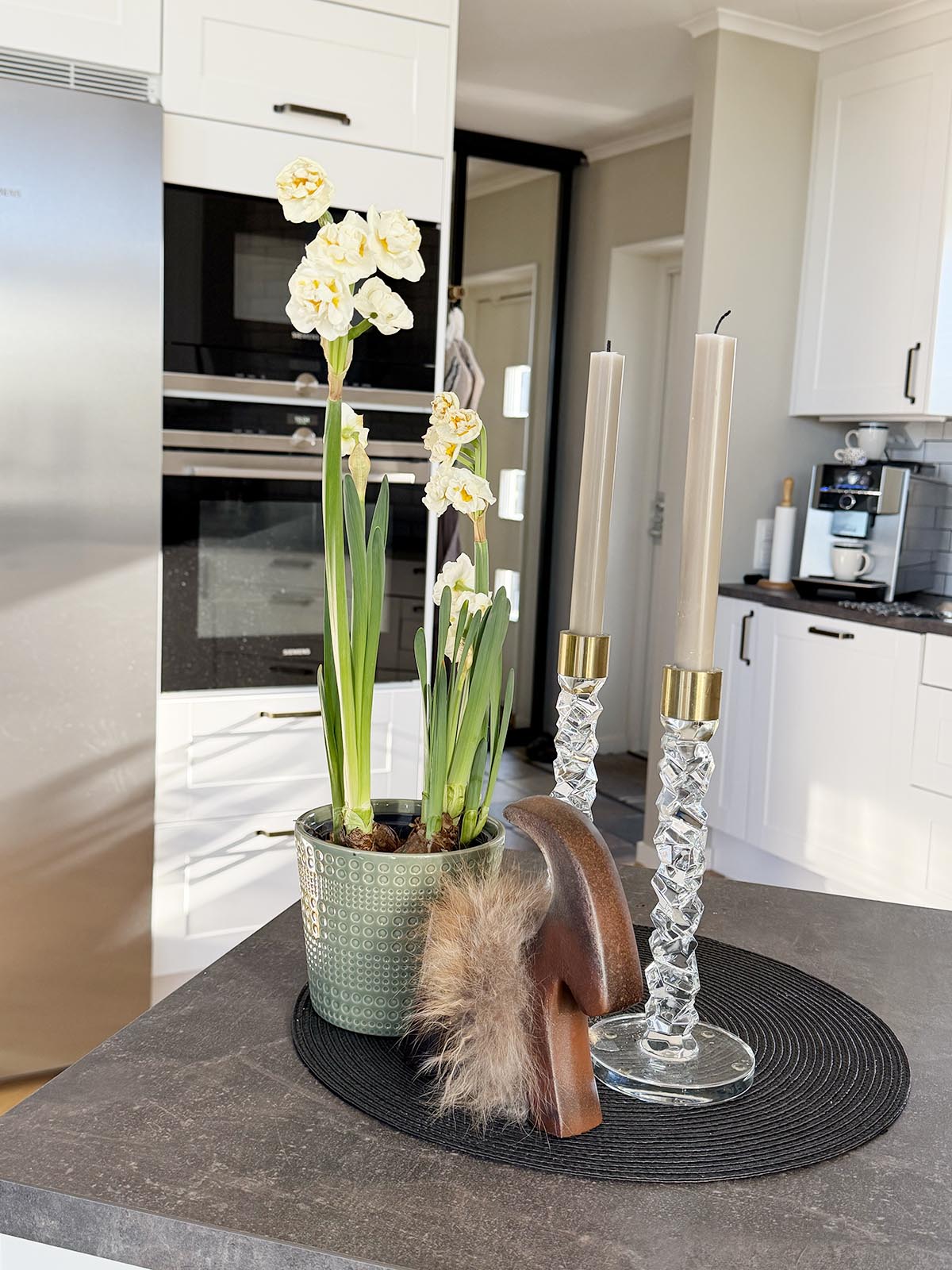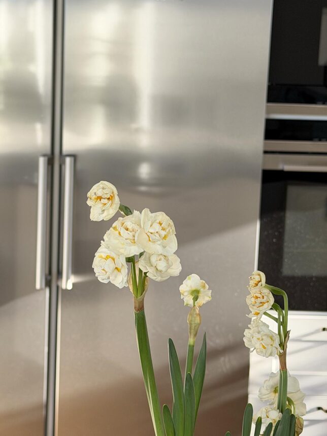 De är så söta de här narcisserna. Bridal crown tror jag de heter. De känns som en lagom övergång mellan vinter och påsk, innan det känns som att det är dags att köpa hem mera gult. Den bildar ett stilleben på köksbänken som avgränsar kök och vardagsrum.
