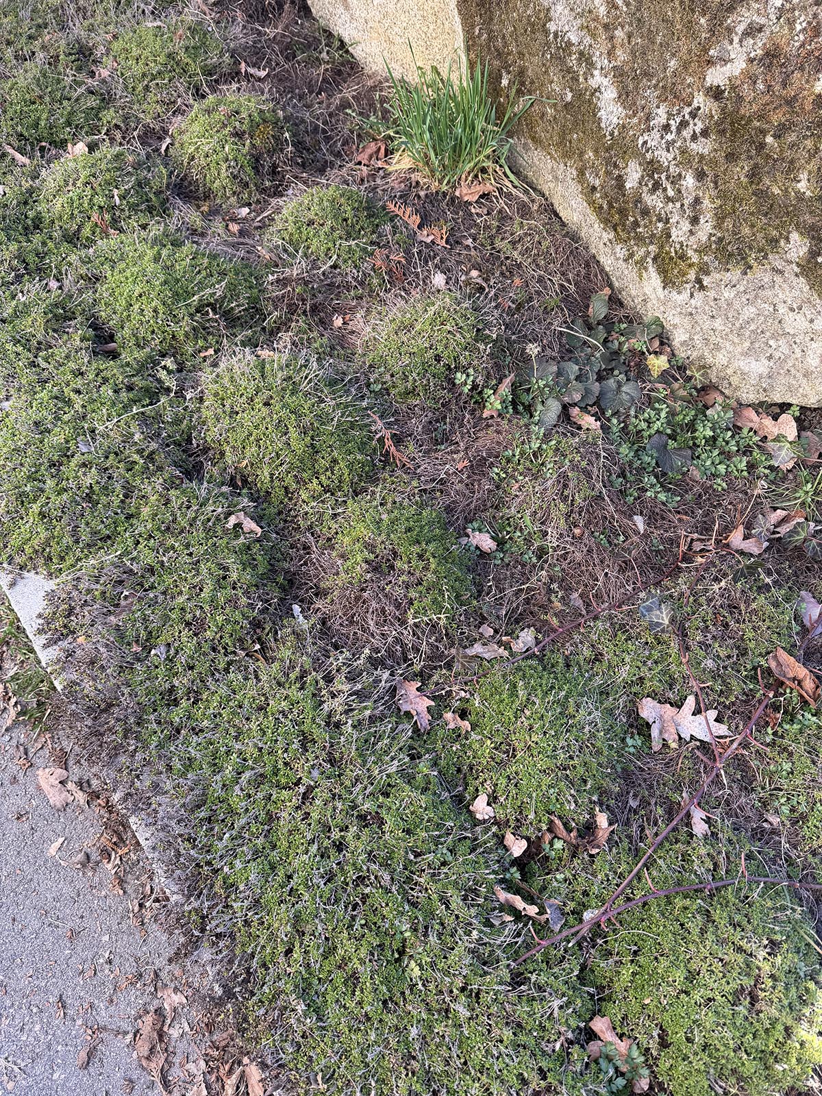 Backtimjan ser lite yrvaken ut än så länge. Lite torrt här och var, men den tar sig nog. Den är ett riktigt bra tips på en tålig växt. Vi har den intill garageuppfarten och där skyfflar vi upp mängder med snö. Den tål att trampas på också. Dessutom blommar den tidigt. Finns i flera färger. Vi har vit. Här kan man se vilket härligt vitt fluffigt hav vi hade 2023.
