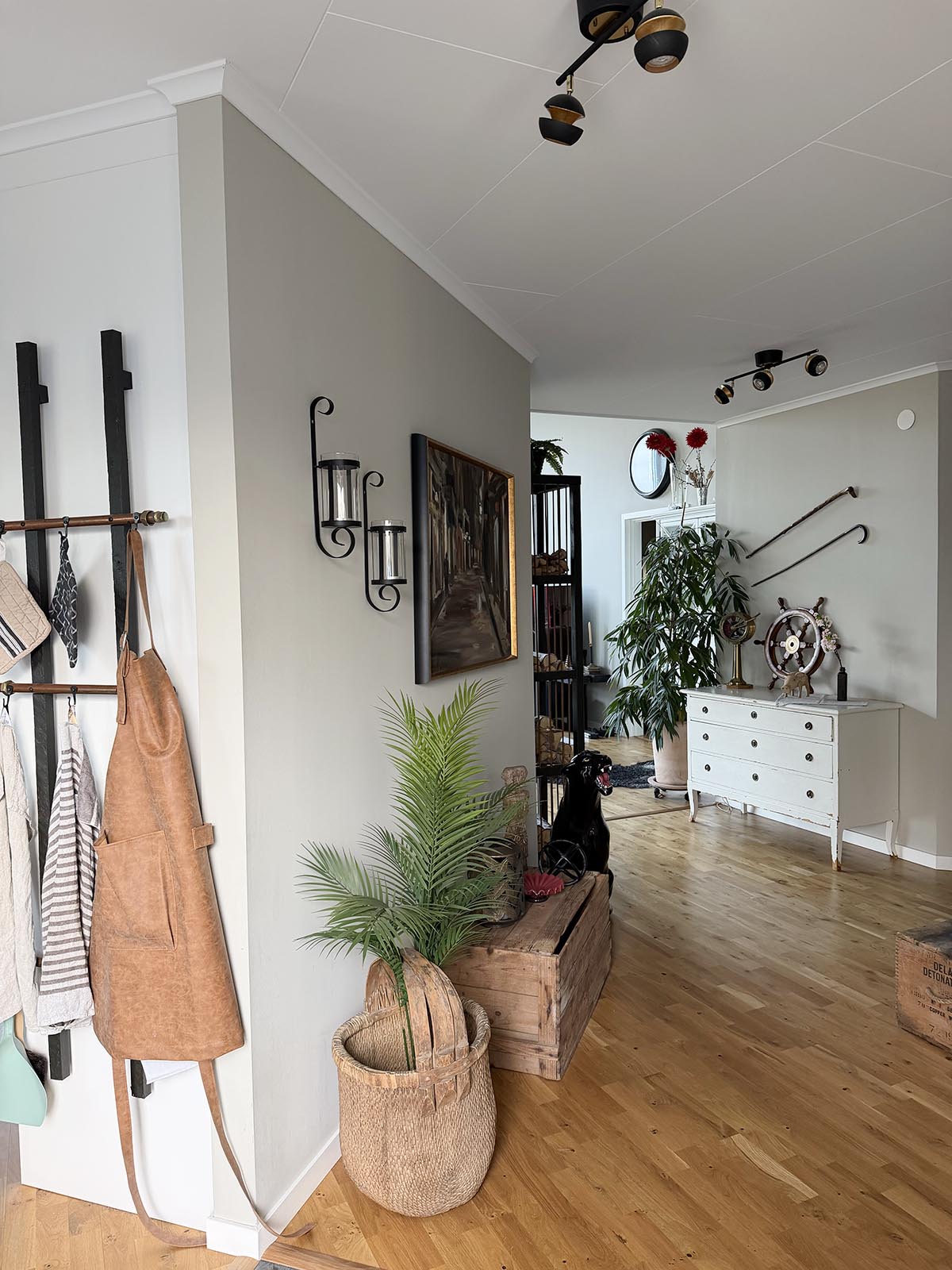 Direkt till vänster i hallen finns köket. Där ser man vår egendesignade och egentillverkade hängare för handdukar, grytlappar och förkläden. Tillverkad i träreglar och kopparrör. En korg med en palm, trälådor med diverse detaljer, vägghängda ljuslyktor i smide, en tavla av en enköpingskonstnär. Längre in finns Andreas gamla porslinspanter som kontrasterar med sin blanka porslin, men också passar in med sin färg och kopplar till vår gemensamma safarieresa (även om vi inte var i panterland).