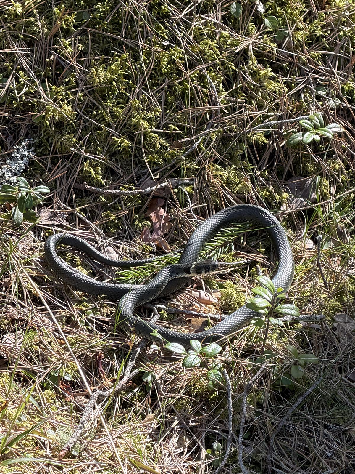 När vi precis skulle vända för att vi inte kom längre så stannade plötsligt Andreas och stoppade mig. ”Kolla där”. Vi stötte oväntat på en kompis i solen. Jag är inte jättebra på ormar. Han trodde det var en snok, men var lite osäker. Jag trodde snokar var jämnsvarta. Men jodå det var en snok. Efter lite efterforskning så lärde vi oss att de är gråsvartbruna, har ett rutmönstrat skinn och ofta en gulaktig nacke.