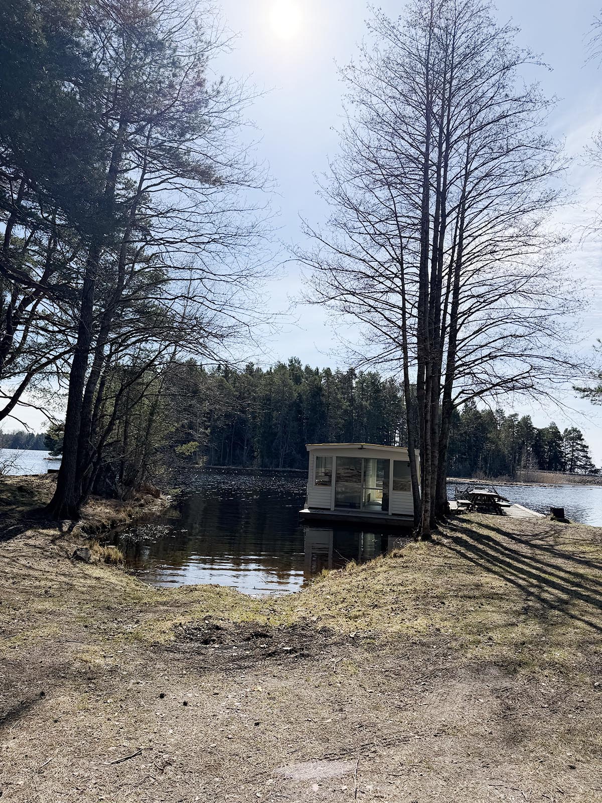 Vi vände tillbaka och svängde in lite på en skogsbilväg. Efter några hundra meter så kom vi till vägs ände och det här dök upp. Wow, vilket mysigt ställe! Två husbåtar med varsitt trädäck låg där och glänste i solen. Oväntade saker dök upp i skogen, som sagt.