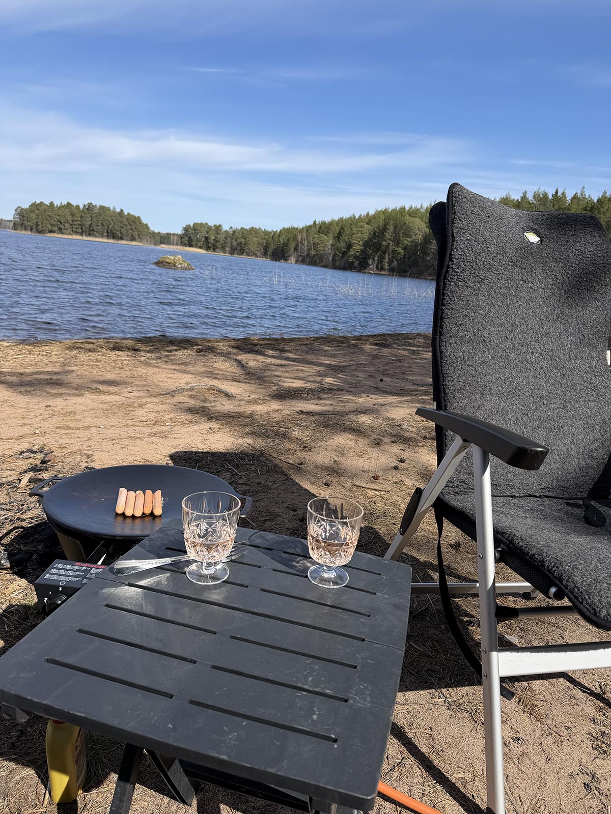 Sen tog vi en skvätt rosé från gårdagen medan korven stektes i Murikkan. Vi lät installera ett gasoluttag på utsidan av husbilen som ansluter till de vanliga gasoltuberna så vi ska slippa släpa med en extra gasoltub till stekhällen. Sen har Andreas fixat en 6 m lång slang så vi kan stå en bit utanför husbilen (och utanför markisen när den är ute). Den räckte perfekt ut i solen.