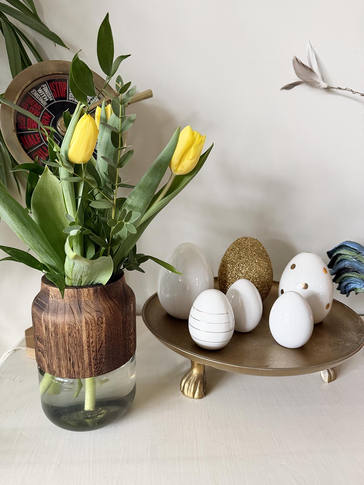 I favoritvasen får några gula tulpaner bo. Och vackra porslinsägg på ett fat. Allt på en gammal byrå i hallen mot vardagsrummet. Och så lite pynt på köksbänken och matbordet. Mer påskpynt än så har det inte blivit. Hälften, typ, ligger kvar i lådorna.