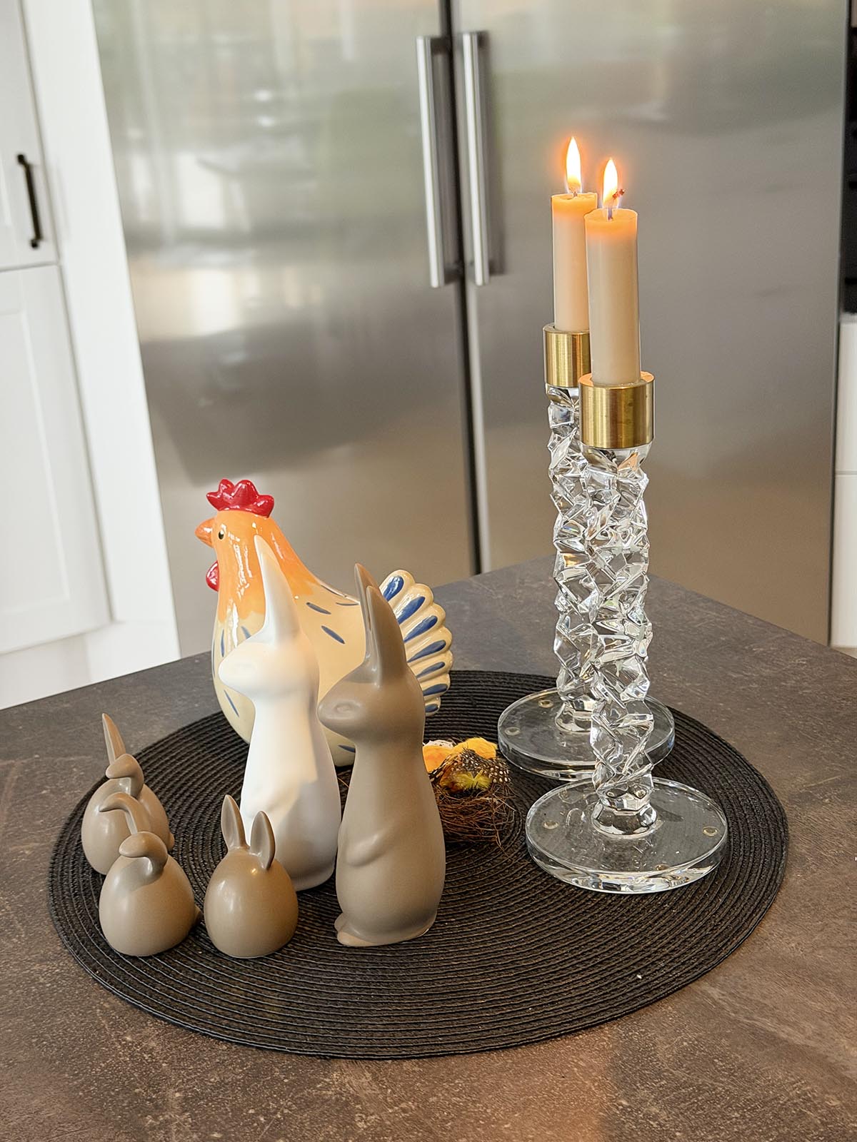 Vi har lite påskpynt på köksön. Jag brukar variera det lite, men i år tror jag det blev nästan samma som förra året.